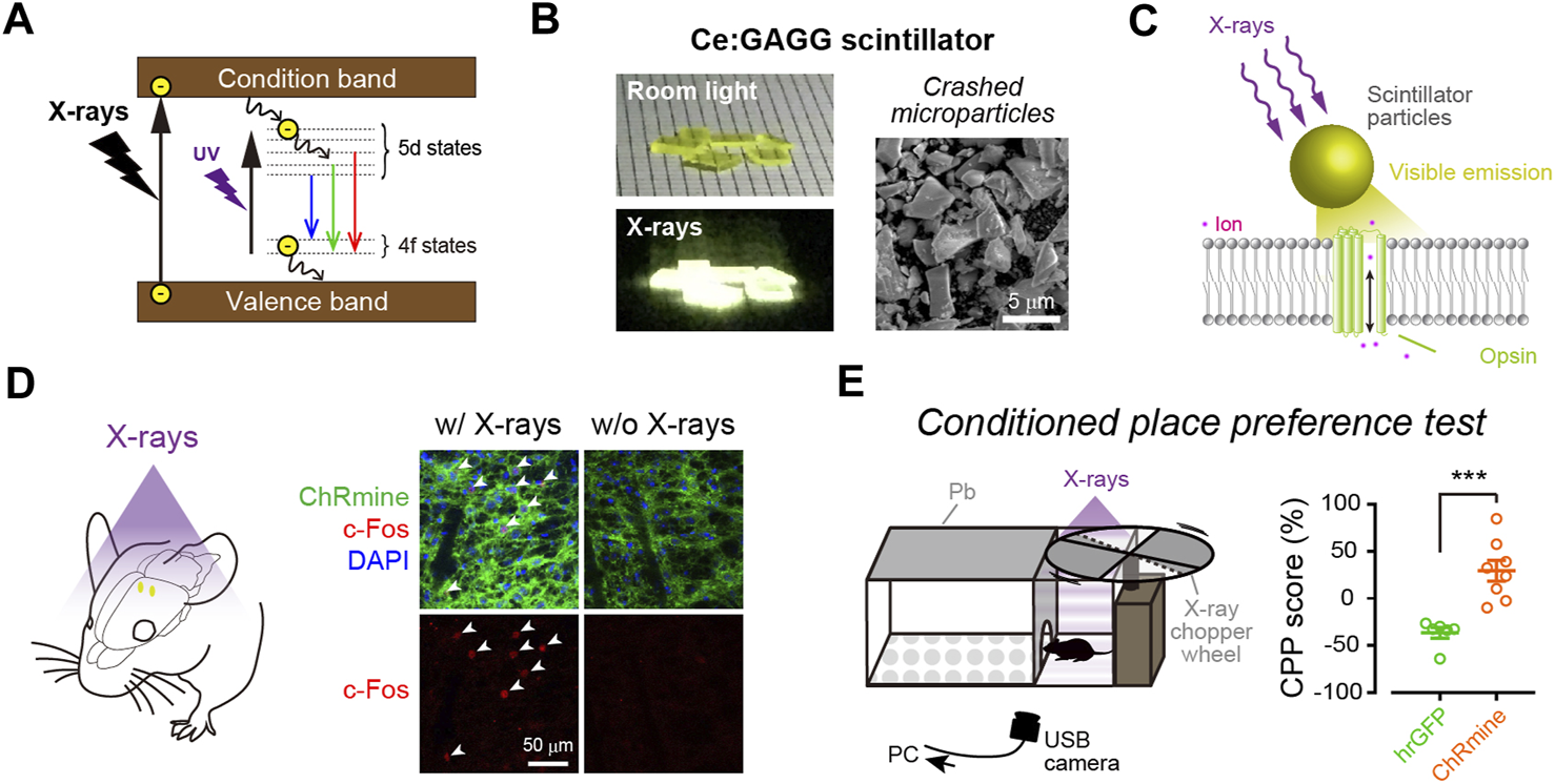 FIGURE 2. X-ray-mediated optogenetics using scintillator microparticles. (A) Schematic of the energy level diagrams of scintillation. (B) Left, images of Ce:GAGG crystals illuminated with room light (top) or X-rays (bottom). Right, a scanning electron micrograph image of Ce:GAGG microparticles. (C) Schematic of the technology. X-ray-induced visible emissions by scintillator particles activate opsins. (D) Expression of cFos (red) is induced in ChRmine-expressing neurons (green) by X-ray-induced radio-luminescence emitted from Ce:GAGG microparticles in vivo at a depth of ∼4.2 mm (the schematic illustrated in left). (E) Conditioned place preference (CPP) can be induced by activating midbrain dopamine neurons with X-ray-mediated optogenetics (right), using a test chamber where X-ray pulses are irradiated in a compartment (left). (B–E), images modified with permission from Matsubara et al. (2021).