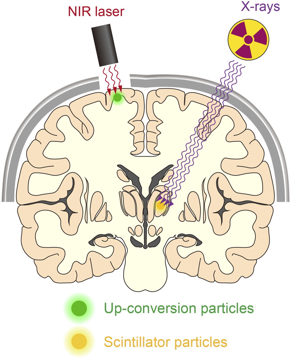 FIGURE 3. Manipulating deep neurons by remote optogenetics. With technological advances, it might be possible to optically manipulate neurons in the human brain. This could aid the treatment of patients with various neurological disorders such as Parkinson’s disease and epilepsy. NIR-mediated up-conversion optogenetics may be applied for neuronal actuation in the cortical regions, whereas X-ray-mediated down-conversion optogenetics is not constrained by tissue depth.