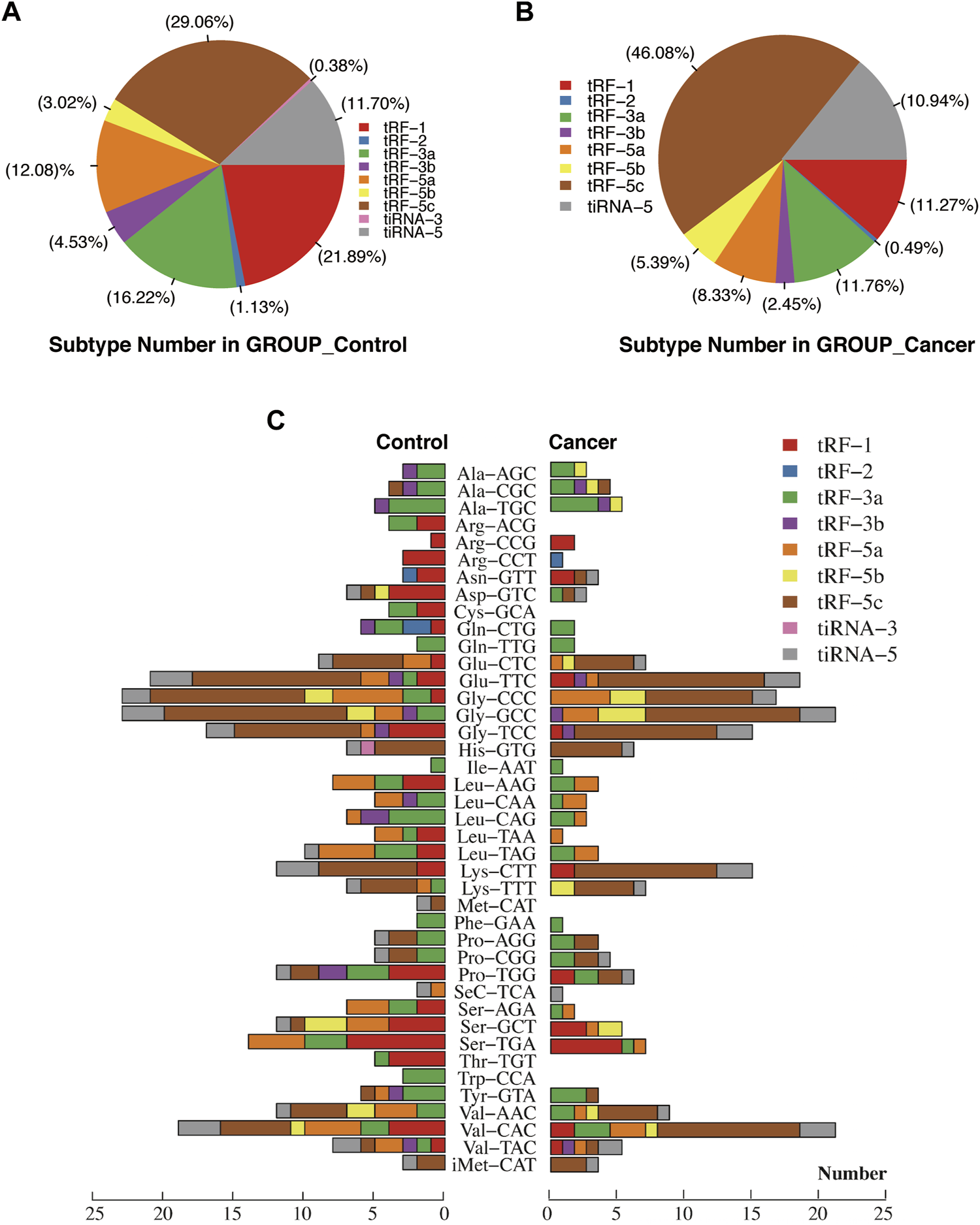 Proportions of subtype tRFs and tiRNAs against tRNA isodecoders between healthy controls and nasopharyngeal carcinoma. (A) Proportions of tRF-1, tRF-2, tRF-3a, tRF-3b, tRF-5a, tRF-5b, tRF-5c, tiRNA-3, and tiRNA-5 in healthy controls. (B) Proportions of tRF-1, tRF-2, tRF-3a, tRF-3b, tRF-5a, tRF-5b, tRF-5c, and tiRNA-5 in nasopharyngeal carcinoma. (C) Stacked plot for all subtypes of tsRNAs between two groups clustering by the anticodon of the tRNAs. The X-axis represents the number of all subtype tsRNAs derived from the same anticodon tRNA, and the Y-axis shows the tRNAs with the same anticodon. The bar with color represents the number of each subtype of tsRNAs. Red, blue, green, purple, orange, yellow, and brown represent the subtypes of tRFs. Pink and gray represent the two subtypes of tiRNAs.