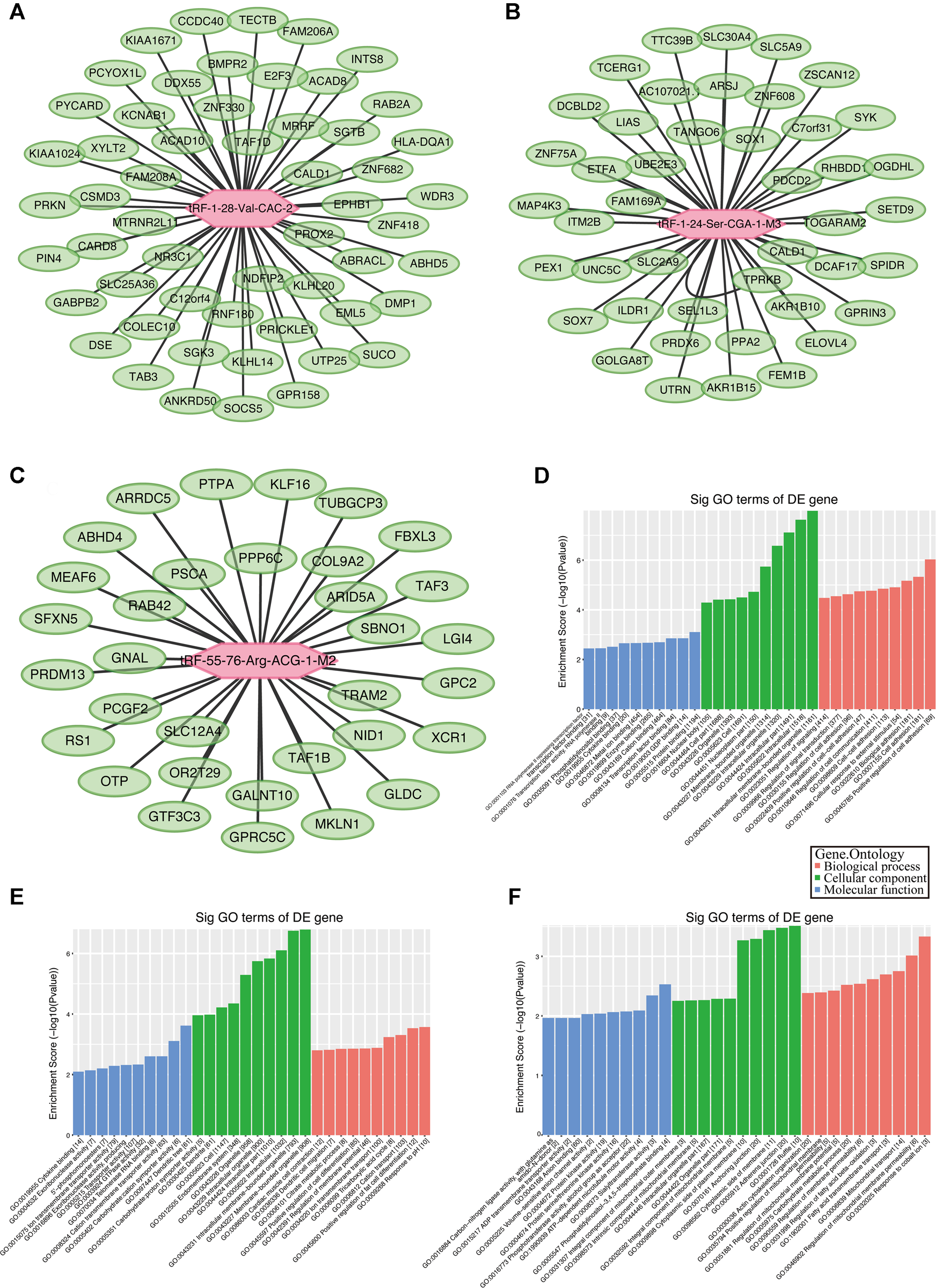 Gene ontology (GO) enrichment analyses for tRF-1:28-Val-CAC-2, tRF-1:24-Ser-CGA-1-M3, and tRF-55:76-Arg-ACG-1-M2. Putative target mRNA genes of (A) tRF-1:28-Val-CAC-2, (B) tRF-1:24-Ser-CGA-1-M3, and (C) tRF-55:76-Arg-ACG-1-M2 with context less than −0.4. (D) GO analysis showed that the target genes of tRF-1:28-Val-CAC-2 mainly participated in regulation of cell communication and signal transduction. (E) Analysis revealed that tRF-1:24-Ser-CGA-1-M3 was a key participant in regulation of cell differentiation. (F) Analysis revealed that tRF-55:76-Arg-ACG-1-M2 is particularly responsible for fatty acid transmembrane transport and regulation of membrane permeability.