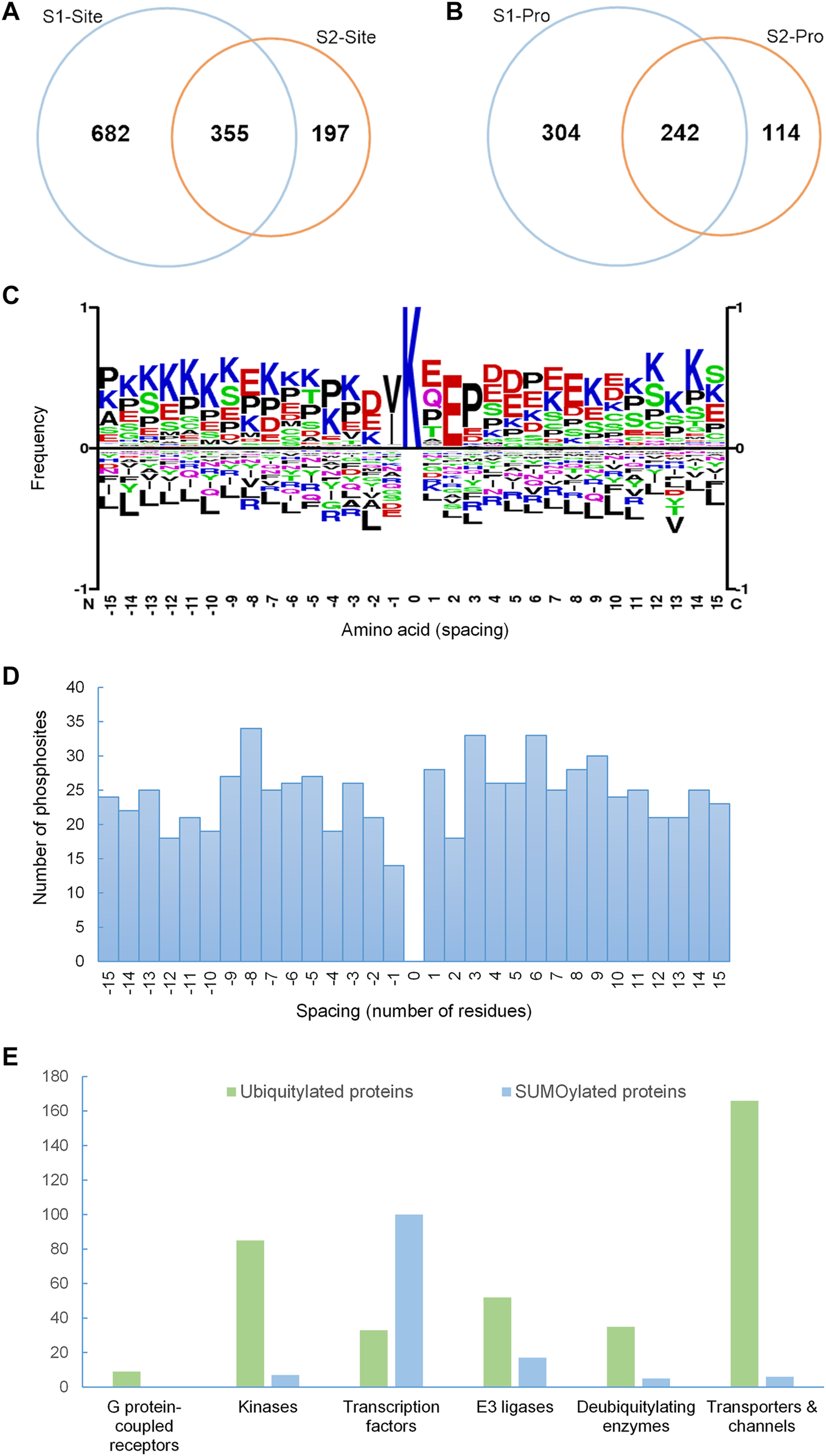 Spacing between identified SUMO sites from this study and all known phosphorylation sites (PhosphoSitePlus, https://www.phosphosite.org/homeAction) in close proximity to the SUMO sites was calculated (Figure 2D).
