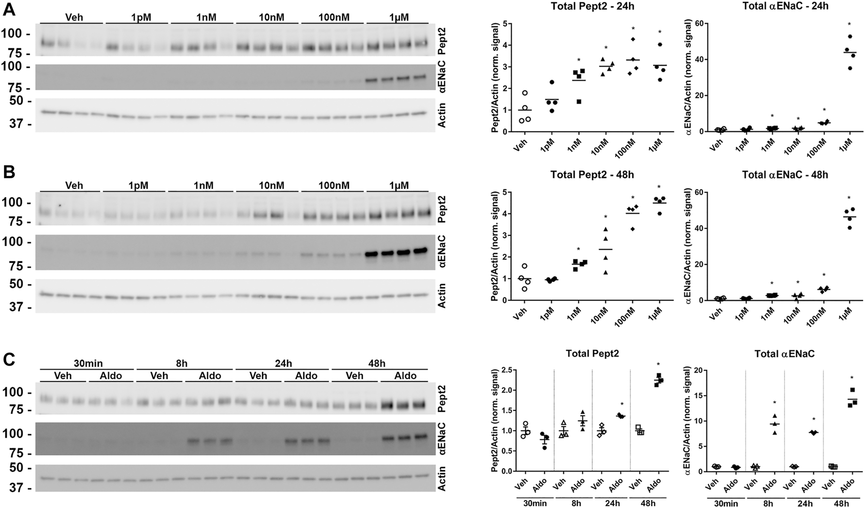 Pept2 is an aldosterone induced protein. (A) mpkDCT cells stably transfected with wild-type mouse FLAG-tagged-Pept2 (WT Pept2) were treated with vehicle (DMSO) or increasing concentrations of aldosterone for 24 h. Samples were probed with antibodies against actin, αENaC and FLAG (detecting Pept2). (B) Similar experiment but 48 h treatment. (C) Increases in Pept2 in mpkDCT cells in response to 1 µM aldosterone over time. *p < 0.05 in unpaired t-test versus vehicle treatment of same cell line.