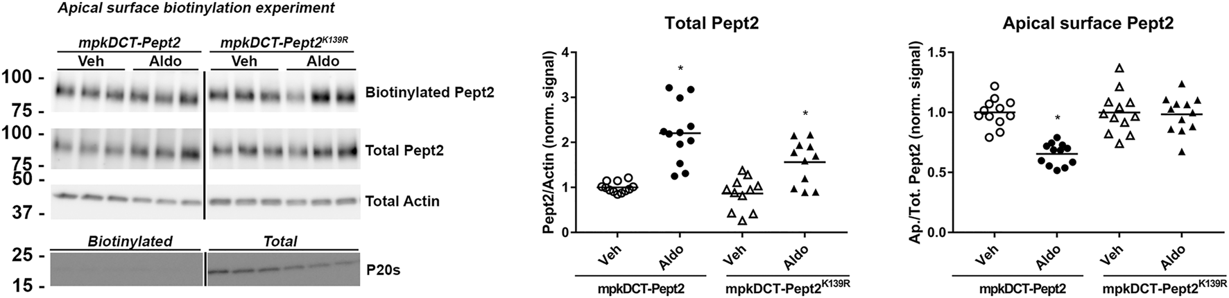 To investigate further the role of K139 in Pept2, we generated mpkDCT cells expressing FLAG-tagged Pept2-WT (mpkDCT-Pept2) or a K139R mutant that prevents this site being SUMOylated (mpkDCT-Pept2K139R). The FLAG-tag was necessary since, despite their applicability to immunolabeling, the Pept2 antibodies we tested were unsuitable for western blotting. In Pept2-WT cells, concentrations of aldosterone >1 nM significantly increased total Pept2 two- to four-fold after 24 h or 48 h treatment (Figures 5A,B respectively). Even at the highest dose (1 µM), aldosterone effects on Pept2 abundance were not observed until 24 h of treatment, whereas effects on another aldosterone-induced protein the α-subunit of the epithelial sodium channel ENAC were observed after 8 h (Figure 5C). In vivo, Pept2 was localized to the apical membrane of DCT cells (Figure 4). To investigate the role of aldosterone for altering the membrane localization of Pept2 and a potential role of SUMOylation at K139, mpkDCT-Pept2 and mpkDCT-Pept2K139R cells were treated with aldosterone (1 µM) for 48 h and apical surface biotinylation performed. Aldosterone increased total Pept2 abundance in both mpkDCT-Pept2 and mpkDCT-Pept2K139R cells (Figure 6). In mpkDCT-Pept2 cells, aldosterone decreased the fraction of Pept2 (relative to total cellular amount) on the apical plasma membrane, suggesting that upon exposure to aldosterone Pept2 is either internalized or has reduced trafficking to the apical membrane. In contrast, in mpkDCT-Pept2K139R cells, Pept2 membrane levels were not altered by aldosterone, suggesting that SUMOylation of K139 is involved in the regulated trafficking of the co-transporter.