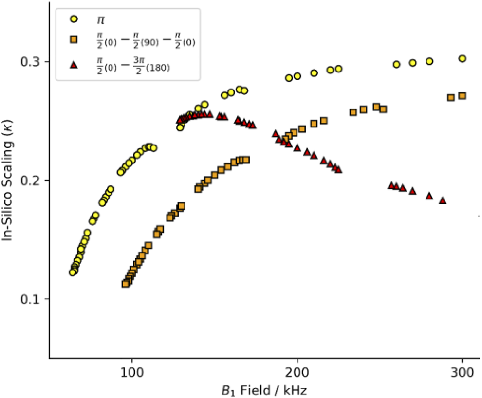 Composite pulses were implemented to compensate for the probe deficiencies since the standard symmetry recoupling experiments were unsuccessful. Two composite-π pulses are prominent in the literature, the [90(0)90(90)90(0)] and [90(0)270(180)] where the flip angle of a portion of the pulse is denoted by the large number and the phase of that portion is denoted by the subscripted number in parentheses (Levitt, 2002). The comparison of the scaling factors determined in silico by simulations with the SIMPSON program (method described below) shows a dramatic change in the scaling factor when the symmetry element is changed. The performance of the [90(0)90(90)90(0)] composite pulse (Figure 1; Supplementary Figure S1, orange squares) follows the same general trend as the standard π pulse (yellow circles), but with worse efficiency and higher applied field. However, the [90(0)270(180)] composite pulse (Figure 1; Supplementary Figure S1, red triangles) does not follow the same trend. The shape of the curve produced by the [90(0)270(180)] composite pulse has a maximum in the curve, whereas the other pulses asymptotically rise. The maximum scaling factor is found at a relatively low field, with performance similar to the π pulse variant.