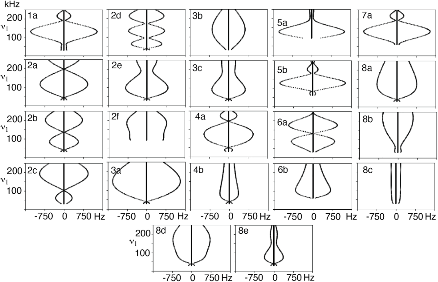 A series of simulations were performed where the applied field was varied from the lowest match condition up to 250 kHz for the composite R-elements to produce dipole recoupling efficiency curves. These curves are well-defined, as demonstrated by the simulations of the symmetry sequence R22219 in Figure 2. It is convenient to vary the applied field and back calculate the variable flip angles and pulse durations to maintain a valid range for the applied field. The choice of the recoupling element results in decoupling in a sequence which is supposed to recouple, which may point to further selection rules for symmetry elements since there are several instances which result in a coupling of zero. These zero-coupling points might be useful for other applications such as decoupling. These zero points are also present with more crystallites, and thus do not appear to be an artifact of the single crystal simulations. The shape of the curve is an indication of the sensitivity to, for example, B1 inhomogeneity or a mis-set match condition, where a flatter curve should mean less sensitive condition. There is a significant zero-frequency in the simulated spectra indicating that some fraction of the polarization is not recoupled, although this component is lost when more crystallites are included in the calculation when the calculations are repeated with crystal averaging, as seen in Supplementary Figure S2.