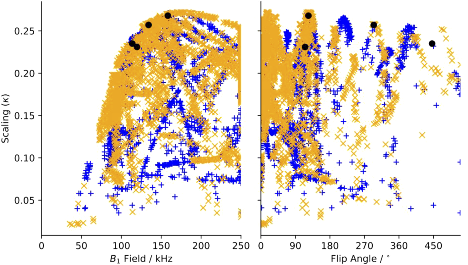 In Figure 3A, there is a clear limit to the performance as a function of the applied field, where the maximum scaling rises quickly up to a maximum of about κ = 0.27 and ω1 = 175 kHz and then slowly reduces as the applied field increases. There are many candidates with κ > 0.225 and ω1 < 150 kHz, which are suitable for further testing. When the scaling is plotted against the flip angle, we find that there are certain flip angles that are favored. The first local maximum is at zero, indicating that at least some sequences do not improve using composite pulses. There are local maxima at about 15° and 35°, but the global maximum occurs when there is a flip angle of about 125°, and then approximately every 90° after.