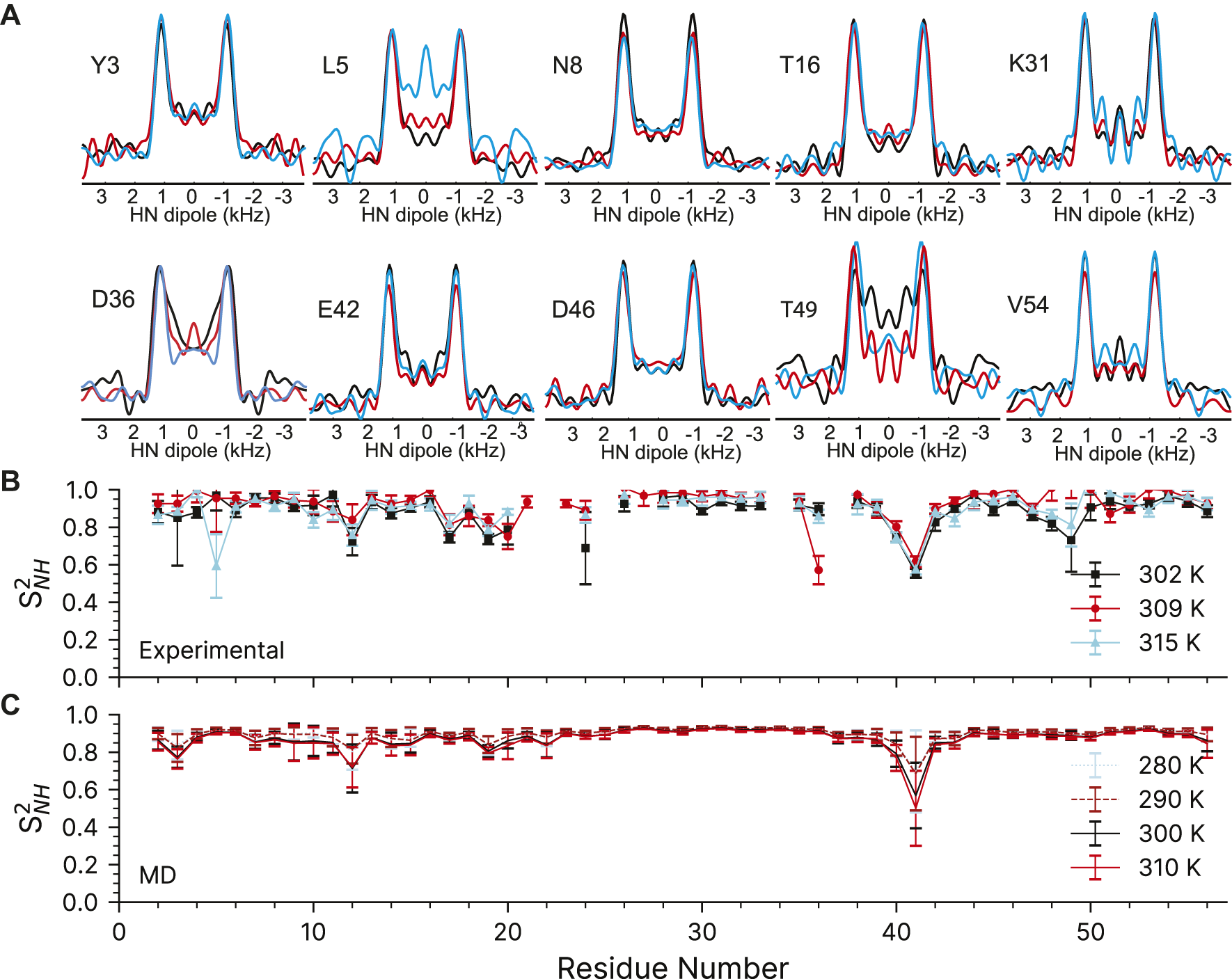 We have also compared the experimentally determined 15N-1H order parameters to those obtained from molecular dynamics simulations performed in the 280–310 K temperature range (Figure 5C). The simulated rates are in general good agreement with the experimental ones (see Supplementary Figure S7). As before (Busi et al., 2018), the MD simulations predict that there should be little change in the order parameters of the expected temperature range.