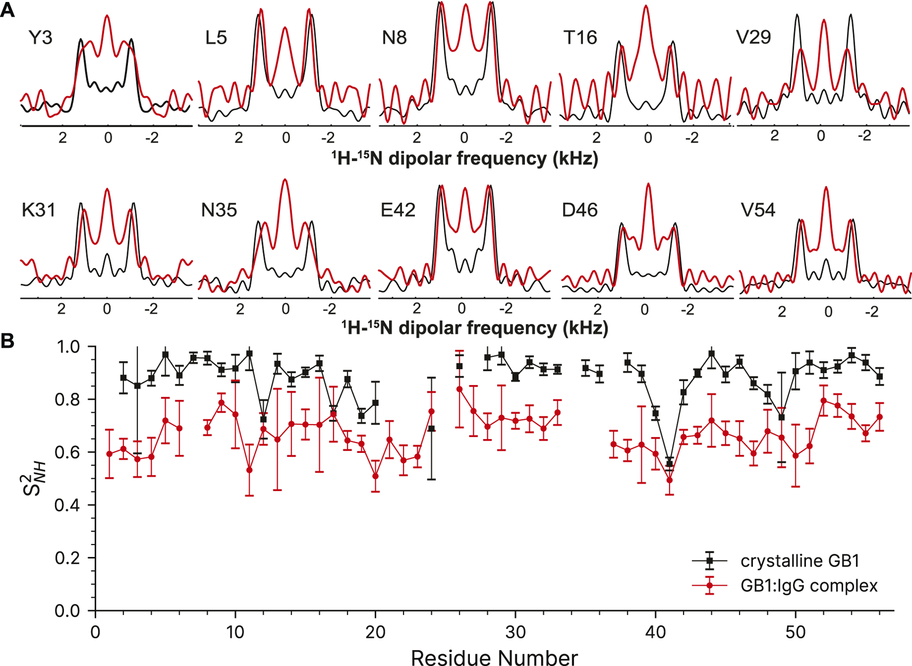 15N-1H dipolar order parameter data for GB1 in a crystal (black line) and in a precipitated complex with IgG (red line). (A) Overlay of representative dipole recoupling spectra. (B)15N-1H order parameters as a function of residue, error bars are drawn at 1σ. Both data sets were recorded at the nominal temperature of 263.2 K corresponding to sample temperature of ∼302 K at 60 kHz spinning frequency.
