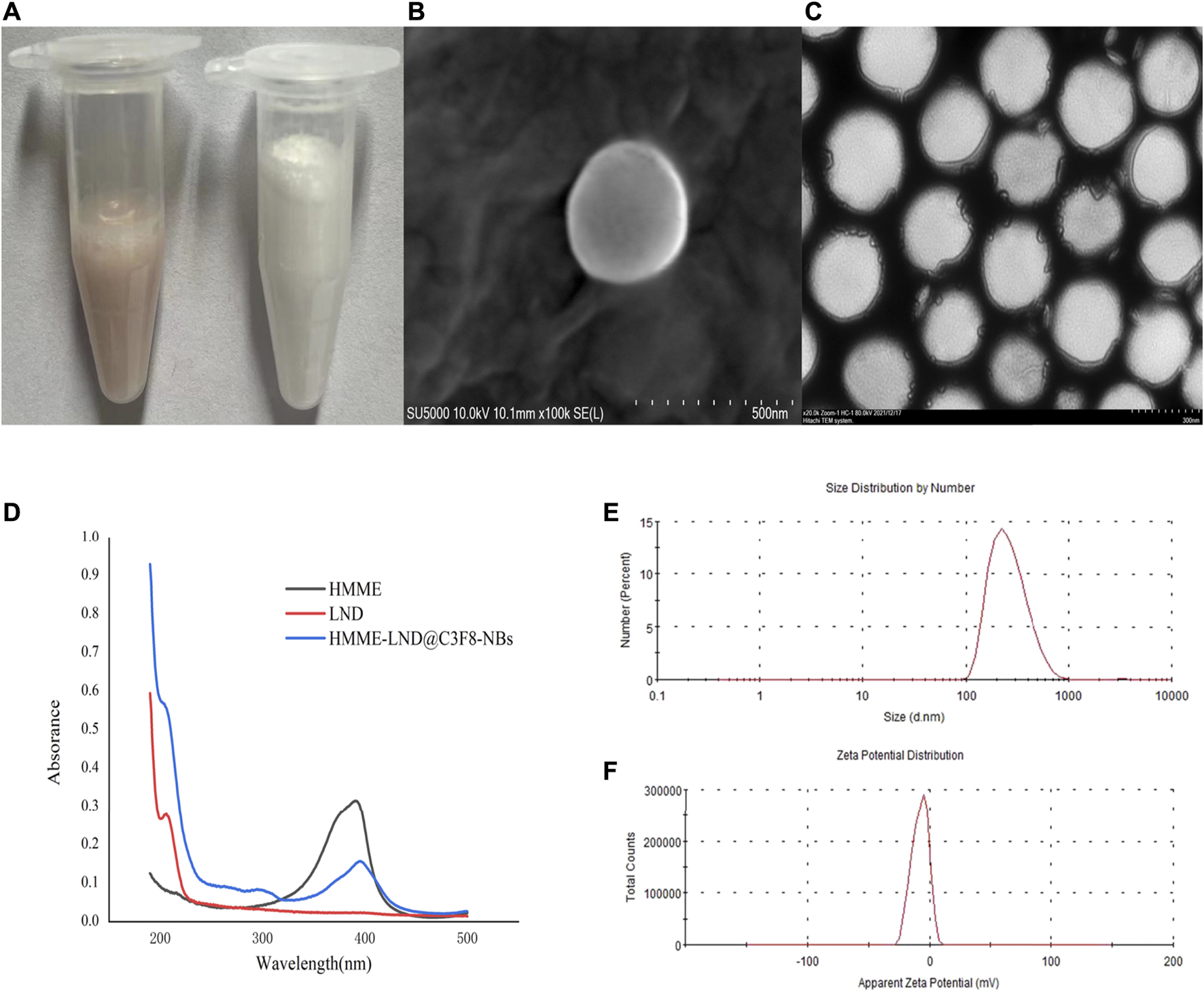 Fabrication and characterization of HMME-LND@C3F8-NBs. (A) The appearance of HMME-LND@C3F8-NBs (left) and pure NBs (right). HMME-LND@C3F8-NBs present with uniformly pink in color. (B) SEM image of HMME-LND@C3F8-NBs. (C) TEM image of HMME-LND@C3F8-NBs. (D) Absorption spectra of HMME, LND and HMME-LND@C3F8-NBs. (E) Size distribution of HMME-LND@C3F8-NBs by number. (F) Zeta potential distribution of HMME-LND@C3F8-NBs.