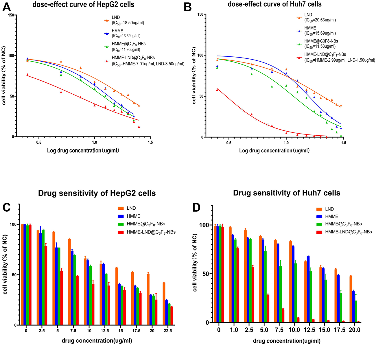 Comparison of drug resistance in the groups of LND, HMME, HMME @C3F8-NBs, and HMME-LND@C3F8-NBs. (A) The dose-effect curves of HepG2 cells to LND (orange curve), HMME (blue curve), HMME@C3F8-NBs (green curve), and HMME-LND@C3F8-NBs (red curve). (B) The dose-effect curves of Huh7 cells to LND (orange curve), HMME (blue curve), HMME@C3F8-NBs (green curve), and HMME-LND@C3F8-NBs (red curve). (C) Drug sensitivity of HepG2 cells to LND (orange column), HMME (blue column), HMME@C3F8-NBs (green column), and HMME-LND@C3F8-NBs (red column). (D) Drug sensitivity of Huh7 cells to LND (orange column), HMME (blue column), HMME@C3F8-NBs (green column), and HMME-LND@C3F8-NBs (red column).