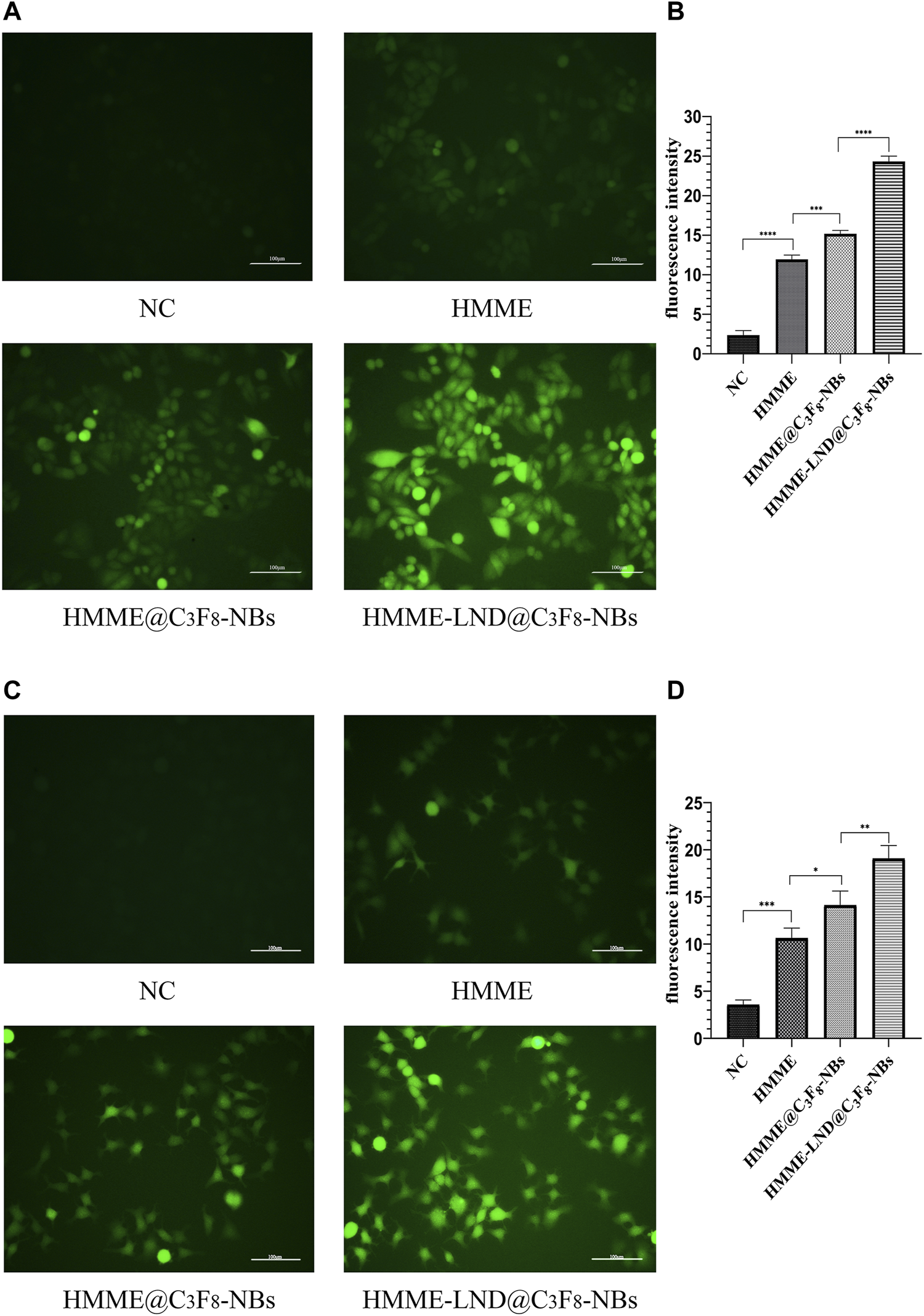 The HMME-LND@C3F8-NBs groups in HepG2 and Huh7 cells exhibited more green fluorescence than the other three groups as shown in Figures 3A,C, which confirms that the HMME-LND@C3F8-NBs could be a more effective sonosensitizer generating ROS with LFUS. The fluorescence intensity of HMME @C3F8-NBs with LFUS was higher than HMME at the corresponding concentrations. Compared with the HMME @C3F8-NBs groups, LND improved the ability of the NBs complex to produce ROS. The quantification of fluorescence intensity in different groups of HepG2 and Huh7 cells was shown in Figures 3B,D. The fluorescence intensity of each group was statistically significant.