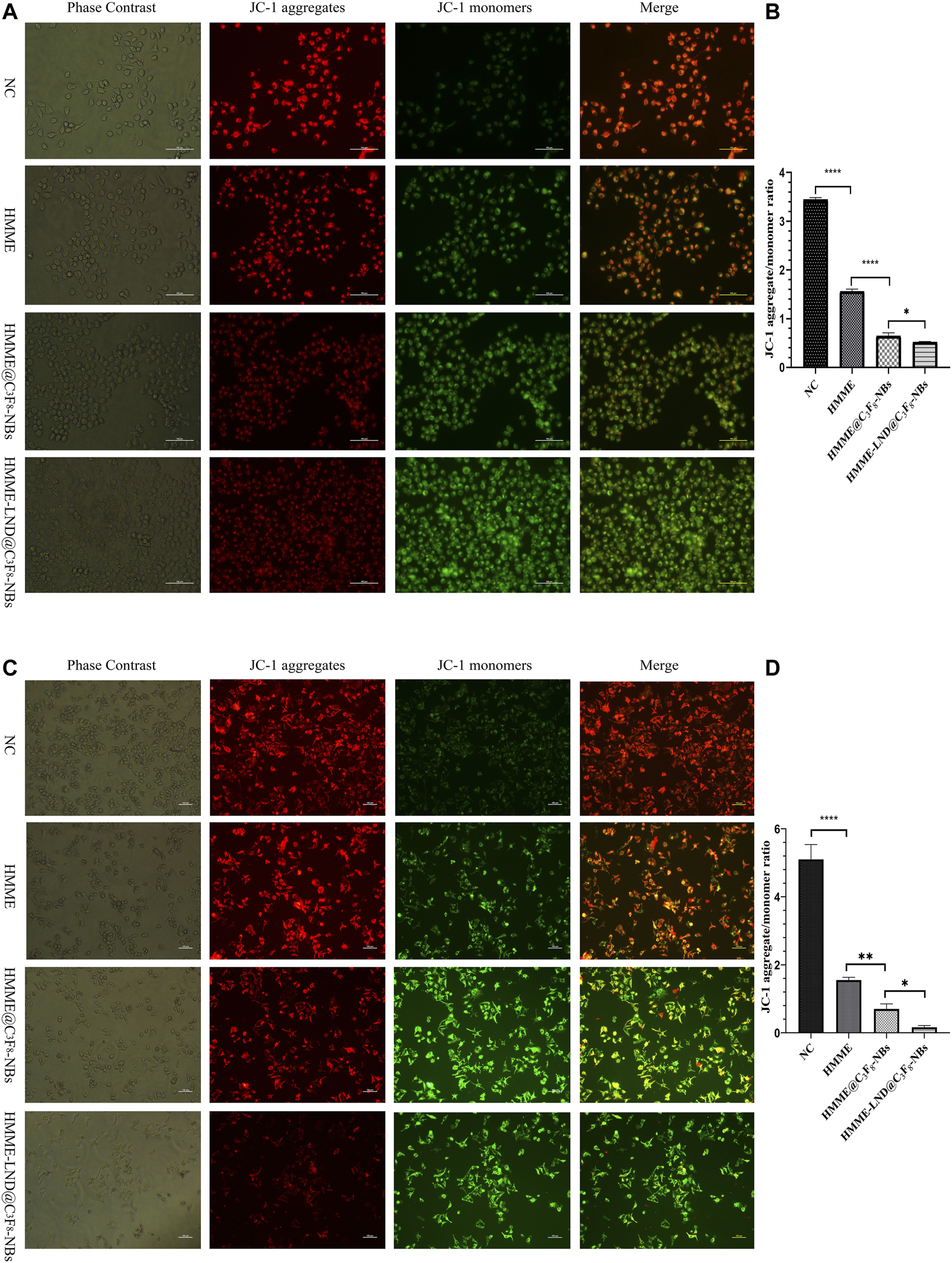 Fluorescence microscopic imaging was used to detect the mitochondrial membrane potential in HepG2 (Figure 4A) and Huh7 cells (Figure 4C). The mitochondrial membrane potential decreased after treatment with HMME-LND@C3F8-NBs more significantly than the control group, which showed conspicuous green fluorescence. NBs mediated with both HMME and LND were more evident than the NBs only mediated with HMME. The ratio of red to green fluorescence decreased memorably, quantifying fluorescence intensity as shown in Figures 4B,D. JC-1 aggregate converted to a monomeric form in the HepG2 cells, and Huh7 cells after SDT mediated with NBs complex, namely, early apoptosis occurred in the treatment group.