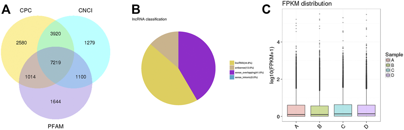 Coding potential analysis. (A) In this Venn diagram, three tools were selected to analyze the coding potentials of lncRNAs, including CNCI, CPC, and PFAM. A total of 7,219 lncRNA transcripts were filtered as novel lncRNAs. (B) The classification of filtered lncRNAs. (C) Boxplots showing the distribution of expression levels of genes.