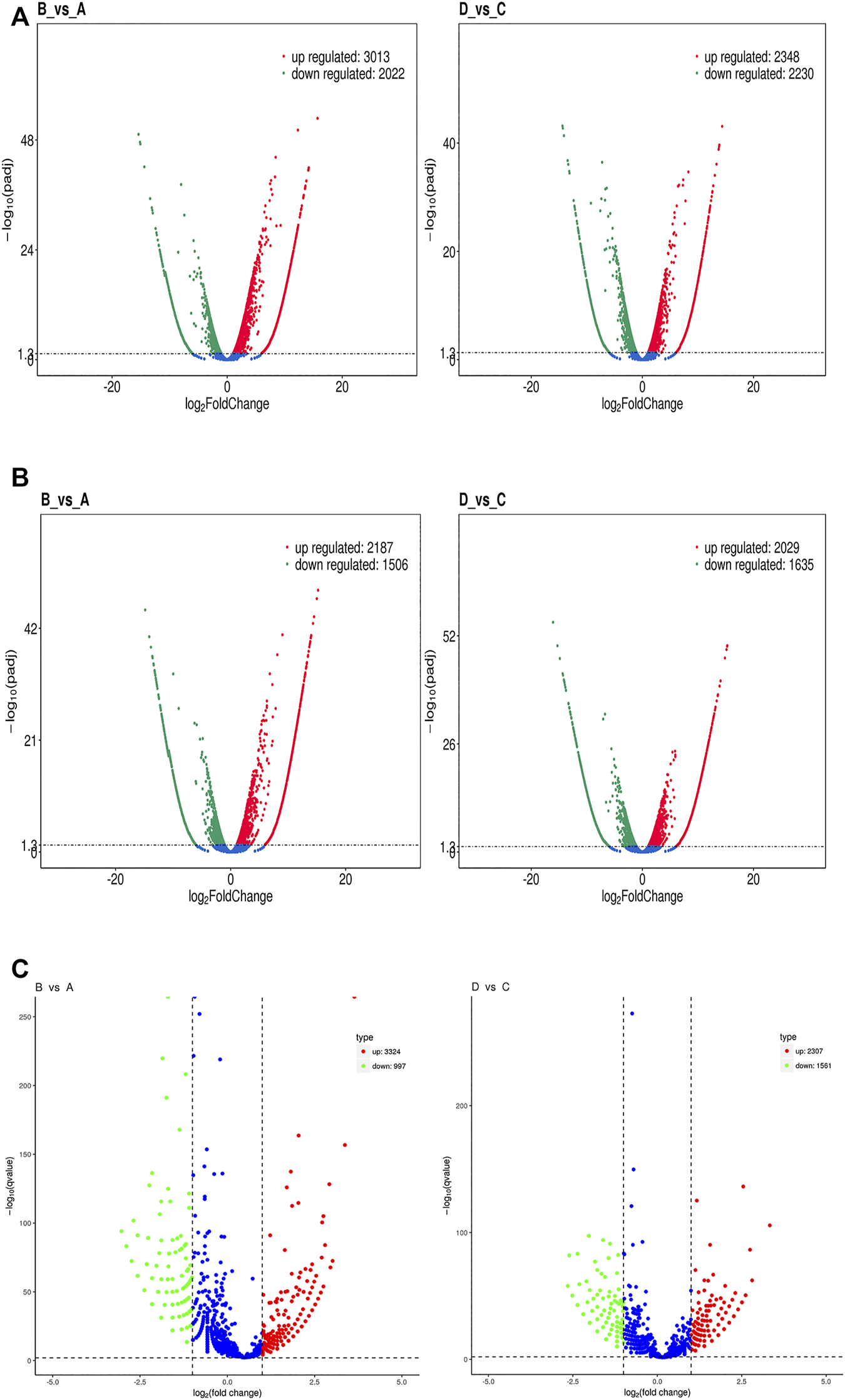 Volcano plots of RNA-Seq data distinguishing each experimental group. (A) A volcano plot of differentially expressed mRNA transcripts between groups B and A (left) and between groups D and C (right). (B) A volcano plot of differentially expressed lncRNA transcripts between groups B and A (left) and between groups D and C (right). (C) A volcano plot of differentially expressed circRNA transcripts between groups B and A (left) and between groups D and C (right). Each red dot denotes an individually upregulated transcript, and each green dot denotes an individually downregulated transcript.