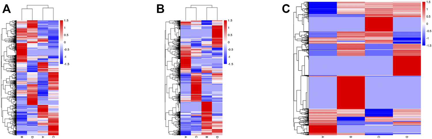 Heat map of hierarchical clustering. The expression profiles of differentially expressed mRNAs (A), lncRNAs (B), and circRNAs (C) of all experimental groups. Red indicates high and blue indicates low expression genes.