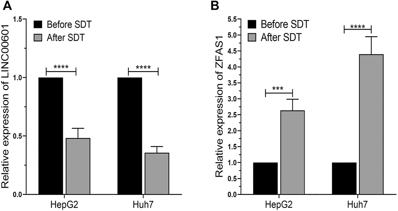 Trizol reagent (Thermo Fisher Scientific, Carlsbad, United States) was used to obtain the RNAs from HepG2 and Huh7 cells. Then, the researcher reverse transcribed the RNA to cDNA (Transcriptor First Strand cDNA Synthesis Kit, Roche, Switzerland, Germany). The qRT-PCR was performed by the SYBR Green real-time detection kit (CWBio, Beijing, China) with the CFX96 Detection System (Bio-Rad, California, United States). The relative expression of LINC00601 and ZFAS1 was calculated using the 2-ΔΔCt method and repeated three times. The following primers were used: LINC00601 (Forward: 5′-GAGCTGCACTGACCAGTAGG-3′, Reverse: 5′GTGCTGGCAGATGGATCACT-3′); ZFAS1: (Forward: 5′-ACGTGCAGACATCTACAACCT-3′, Reverse: 5′-TACTTCCAACACCCGCAT-3′); GAPDH (Forward: 5′-CATGAGAAGTATGACAACAGCCT-3′, Reverse: 5′-AGTCCTTCCACGATACCAAAGT-3′).