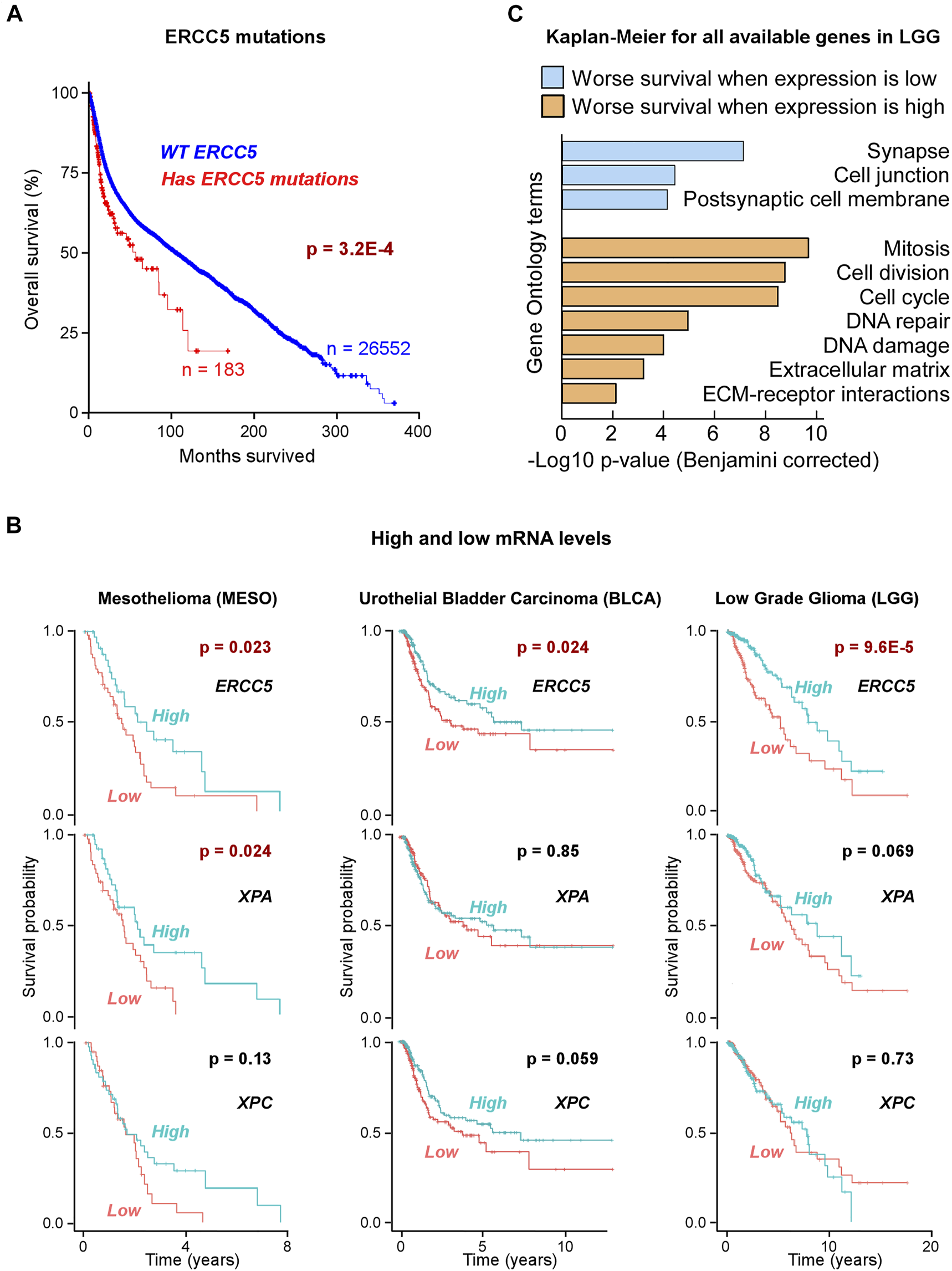 Correlation of ERCC5 (XPG) expression in tumors with patient survival (A) Kaplan–Meier (KM) plot of patients with or without ERCC5 mutations in their tumors (all cancers), as a function of patient survival after diagnosis. Patients with ERCC5 mutations in their tumors are at higher risk. Data are in Supplementary Table S1. (B) Prognostic risk for tumors with low ERCC5, XPA, or XPC expression. KM plots of patients with tumors that had ERCC5, XPA, or XPC mRNA expression levels above and below the mean. Plots are shown for the three cancers with significant prognostic risk based on ERCC5 expression: mesothelioma (MESO), low grade glioma (LGG), and bladder urothelial carcinoma (BLCA). Only low XPA expression in mesothelioma showed significant risk. Data are in Supplementary Tables S2, S3. (C) Benjamini–Hochberg-corrected p-values and most significant Gene Ontology (GO) terms for gene enrichment analysis of genes identified to yield KM logrank p-values <1 × 10−4 when expressed at low (below or equal to the mean, blue) or high (above the mean, orange) levels in LGG patients. Data are in Supplementary Table S4.
