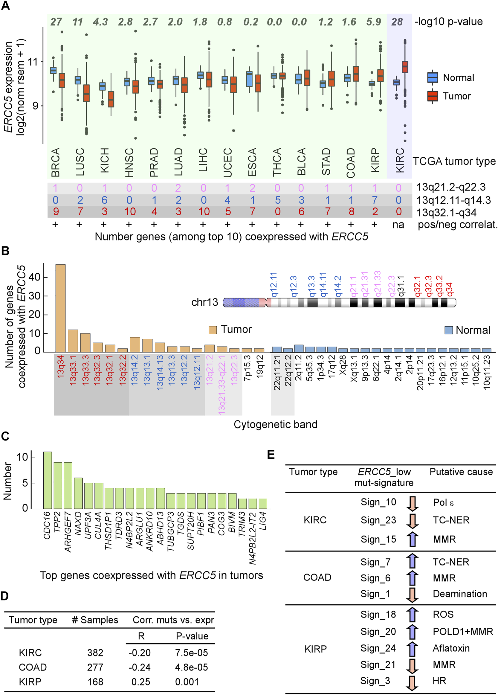 Analysis of ERCC5 (XPG) expression in tumors. (A)Top, ERCC5 gene expression in tumors and matched normal tissues from TCGA. p-values from Wilcoxon tests. Bottom, number of genes out of top 10 whose expression was most highly correlated with that of ERCC5 in tumors and their location in cytogenetic bands. +, positive correlations; green background, tumors with ERCC5-coexpressed genes on chromosome 13; violet background, tumor without ERCC5-coexpressed genes on chromosome 13. Data are in Supplementary Tables S5, S6. (B) Total number of genes from panel A in each cytogenetic band for tumors and matched controls and cartoon of selected chromosome 13 cytogenetic bands. Data are in Supplementary Table S7. (C) Types of genes co-expressed with ERCC5 in tumors from panel A. Data are in Supplementary Table S8. (D) Tumor types that exhibited significant correlations between number of exome-wide simple mutations (single base substitutions and small indels) and ERCC5 expression. R, Pearson’s correlation coefficient; p-values from Welch’s t-tests. Data are in Supplementary Table S9. (E) Samples from Panel D were divided into two groups, one with ERCC5 expression below (ERCC5_low) and the other with ERCC5 expression above (ERCC5_high) the median; then, 30 COSMIC mutational signatures (https://cancer.sanger.ac.uk/cosmic/signatures) were compared between the two groups. Arrows indicate whether the ERCC5_low group incurred significantly less (pink) or more (blue) mutations (from Welch’s t-tests) than the ERCC5_high group. Signature 10 has been attributed to mutations in polymerase epsilon and defective leading-strand DNA synthesis. Signatures 7 and 23 have been associated with transcription-coupled NER (TC-NER); signatures 6, 15, and 21 have been linked to mismatch repair (MMR) defects; signature 1 has been linked to spontaneous 5mC deamination at CpG sites; signature 18 has been linked to reactive oxygen species (ROS); signature 3 has been linked to defective homologous recombination (HR); and signature 24 has been linked to exposure to aflatoxin. Data are in Supplementary Table S10.