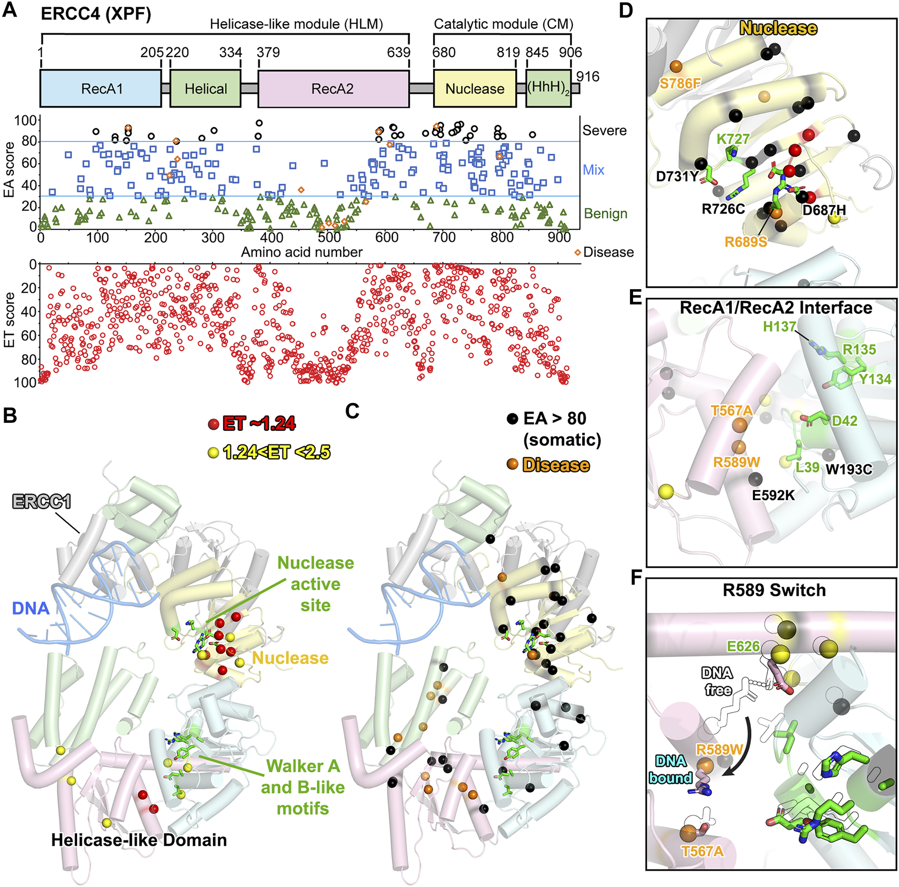 In sum, we found that XPF disease mutations have benign to severe EA/ET predictions. Low ET (significant), disease and severe-scoring EA sites not only mapped to the nuclease domain but also to the helicase-like domain, suggesting its significance possibly for structure-specific DNA binding despite a lack in ATP hydrolysis. Those mutations mapped to the interface between RecA1 and RecA2 suggests a conformational change, indicated by comparisons between the DNA-free and DNA-bound XPF-ERCC1 structures (Jones et al., 2020). We suggest that XPF-ERCC1, like other structure-specific nucleases, requires licensing by validating the aberrantly structured DNA substrate before incision may occur, and that licensing entails conformational shifts to allow the scissile phosphate to access the nuclease active site (Dehe and Gaillard, 2017).