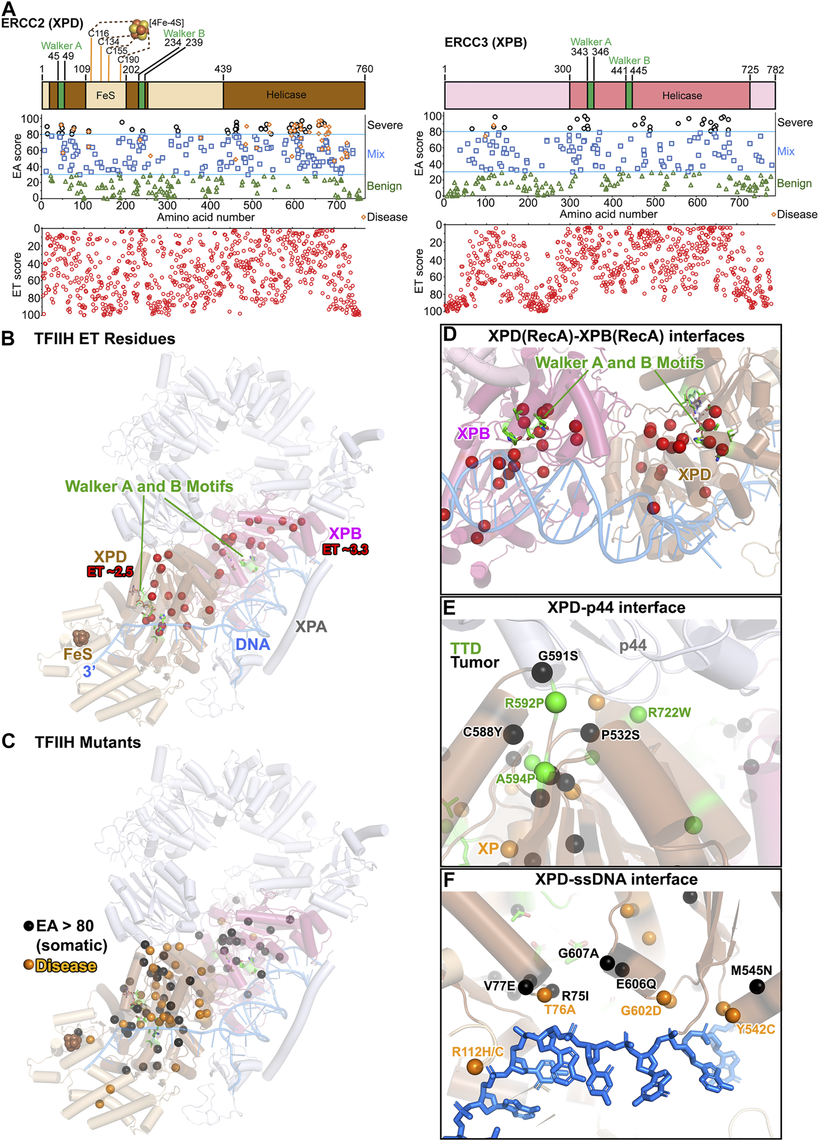 TFIIH: ERCC2 (XPD) and ERCC3 (XPB) ET, disease, and EA80 VUS. (A)Top, ERCC2 (XPD) and ERCC3 (XPB) domain schematics; middle, disease mutants and VUS mapped with EA scores; bottom, amino acid residue mapped with ET scores. (B) The most significant residues based on ET scoring, mapped onto a cartoon depiction of TFIIH (PDB: 6R04) with XPA and branched DNA. Colors correspond to (A). (C) Disease and EA80 VUS, mapped onto a cartoon depiction of TFIIH, as in (B). (D) Close-up view of Walker A and B motifs in XPB and XPD, highlighting ET-identified sites. Model and colors are the same as (B). (E) Close-up view of the XPD–p44 interface, highlighting disease and EA80 mutations. Model and colors are the same as (C). (F) Close-up view of the XPD–ssDNA interface, highlighting disease and EA80 mutations. Model and colors are the same as (C).