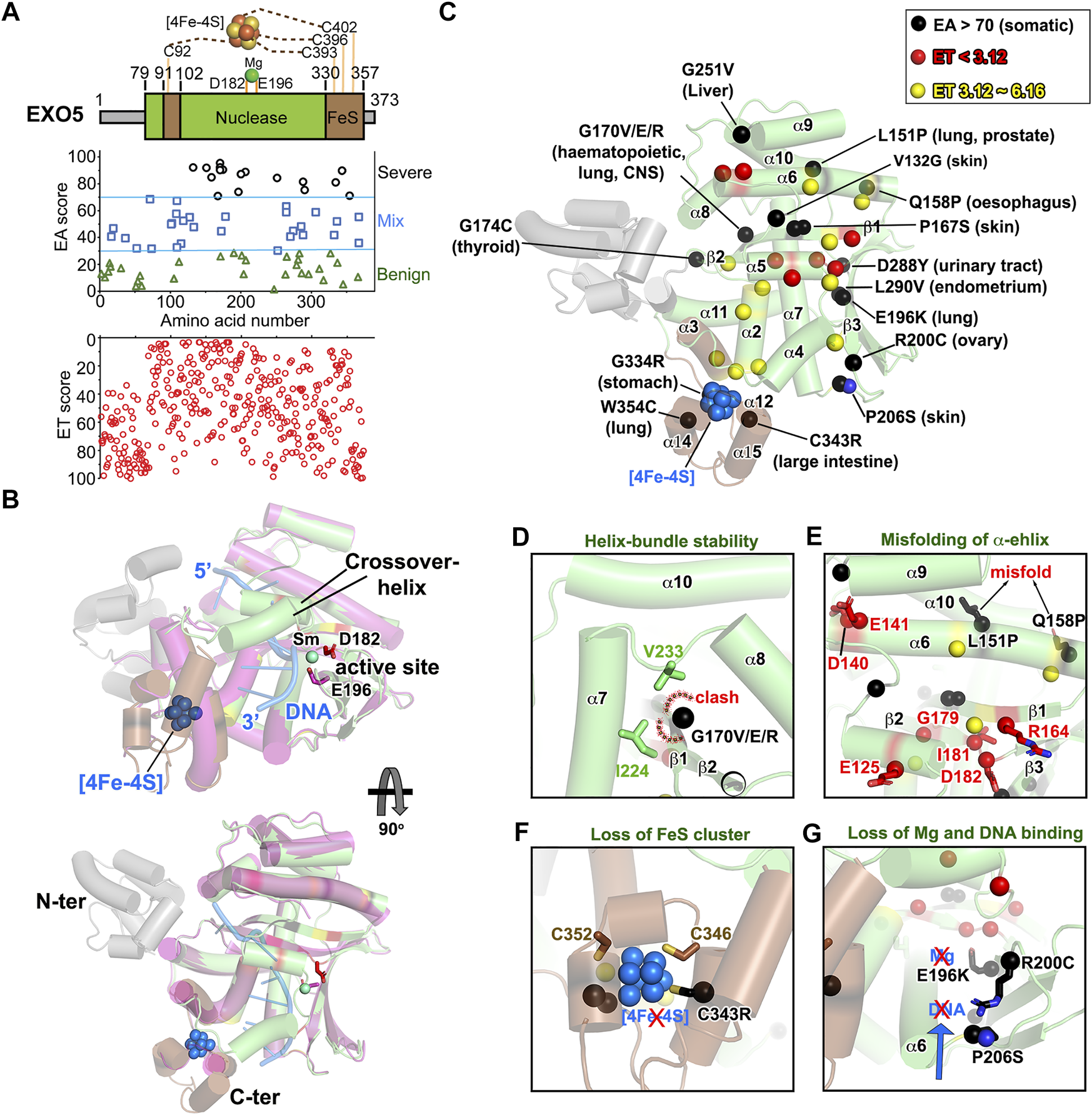 EXO5 nuclease structure folding is impacted by EA70 VUS. (A)Top, EXO5 domain schematic; middle, disease mutants and VUS mapped with EA scores; bottom, amino acid residue mapped with ET scores. (B) Structure overlay of DNA-free (PDB: 7LW7) and DNA-bound EXO5 (PDB: 7LW9). Metal binding site is shown as sticks on D182 and E196. (C) ET and EA70 (shown in red, yellow, and black spheres) mapping on the EXO5 structure with corresponding tumor sites. (D–G) Close-up view of impacts of EA70 VUS on structure folding and the DNA/metal binding site of EXO5.