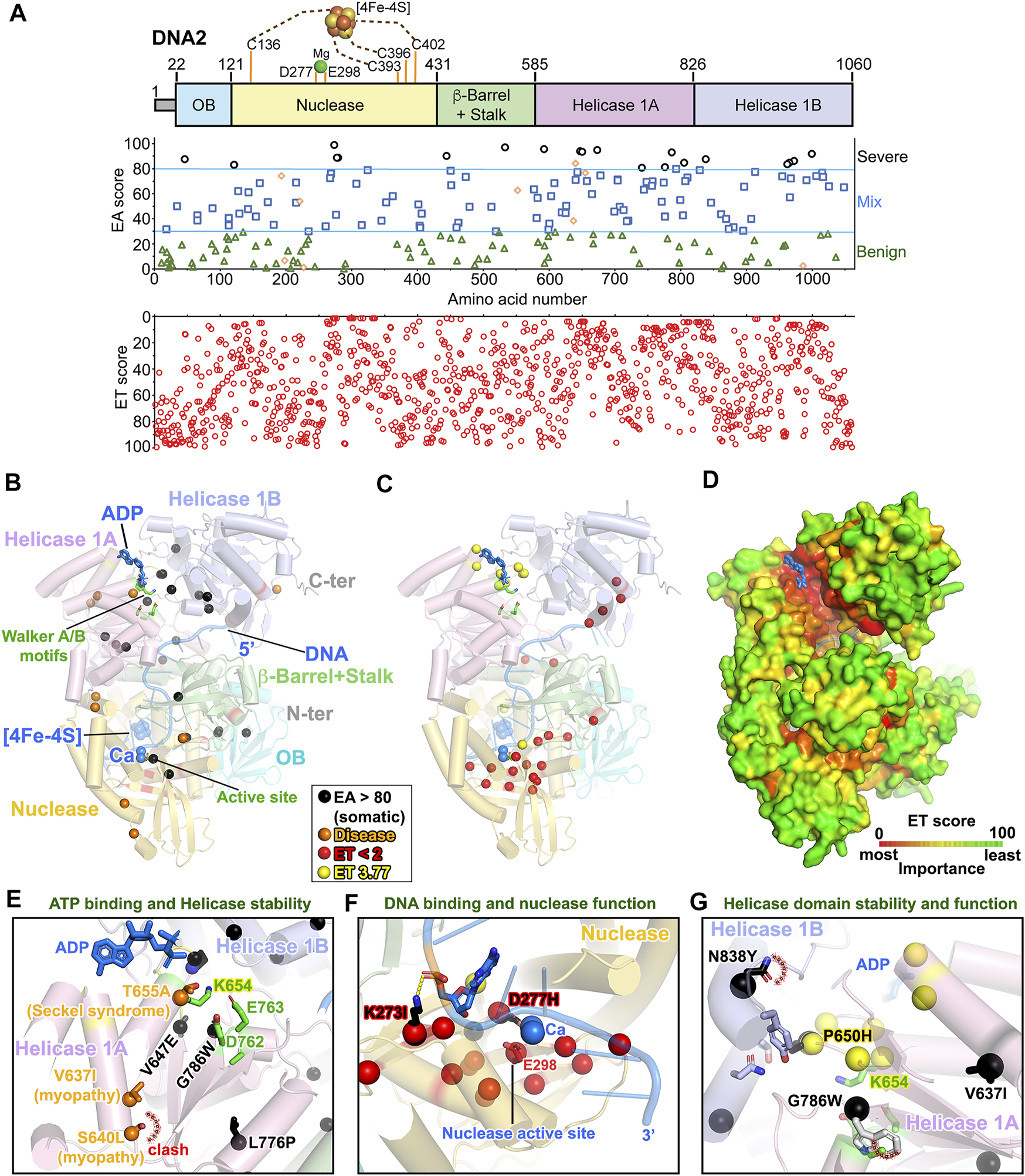 EA80 VUS are mostly clustered at DNA2 helicase domain interface. (A)Top, DNA2 domain schematic; middle, disease mutants and VUS mapped with EA scores; bottom, amino acid residue mapped with ET scores. (B) Disease mutation and EA80 VUS (orange and black spheres) are mapped on DNA2 structure (AlphaFold + DNA/Ca/FeS/ADP from PDB: 5EAN) shown in cartoon depiction. Domains are colored, corresponding to (A). (C) The most significant residues (red and yellow spheres) based on ET scoring are mapped onto the DNA2 structure. (D) ET mapping on the DNA2 structure in surface presentation. DNA and ADP are shown as blue ribbon and sticks, respectively. (E–G) Close-up view of impacts of disease and EA80 VUS on helicase/nuclease domains of DNA2. Spheres and sticks are colored according to EA/ET on (B) and (C). Overlapping EA/ET/disease residues are shown in their corresponding colors.