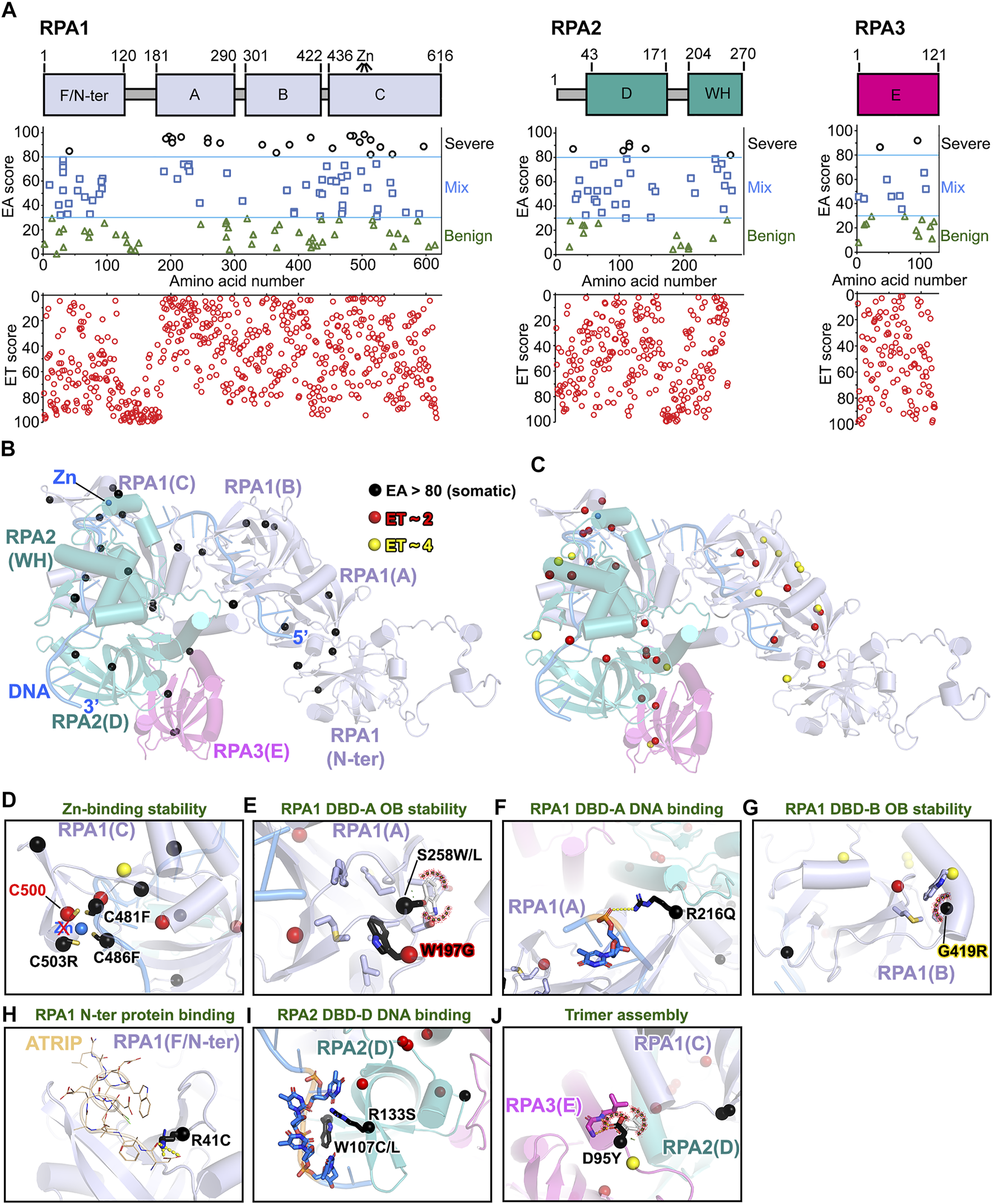 EA80 VUS of RPA impact OB-folds. (A)Top, RPA1-2-3 domain schematics; middle, disease mutants and VUS mapped with EA scores; bottom, amino acid residue mapped with ET scores. (B) EA80 VUS (black spheres) are mapped on RPA structure (RoseTTAFold + DNA/Zn from PDB: 4GOP) shown in cartoon depiction. Domain colors correspond to (A). (C) The most significant residues (red and yellow spheres) based on ET scoring are mapped onto the RPA structure. (D–J) Close-up views of impacts of EA80 VUS on OB-folds, DNA binding, and trimer assembly of RPA. Sphere and sticks are colored according to EA/ET on (B) and (C). Overlapping EA/ET/disease residues are shown in their corresponding colors.