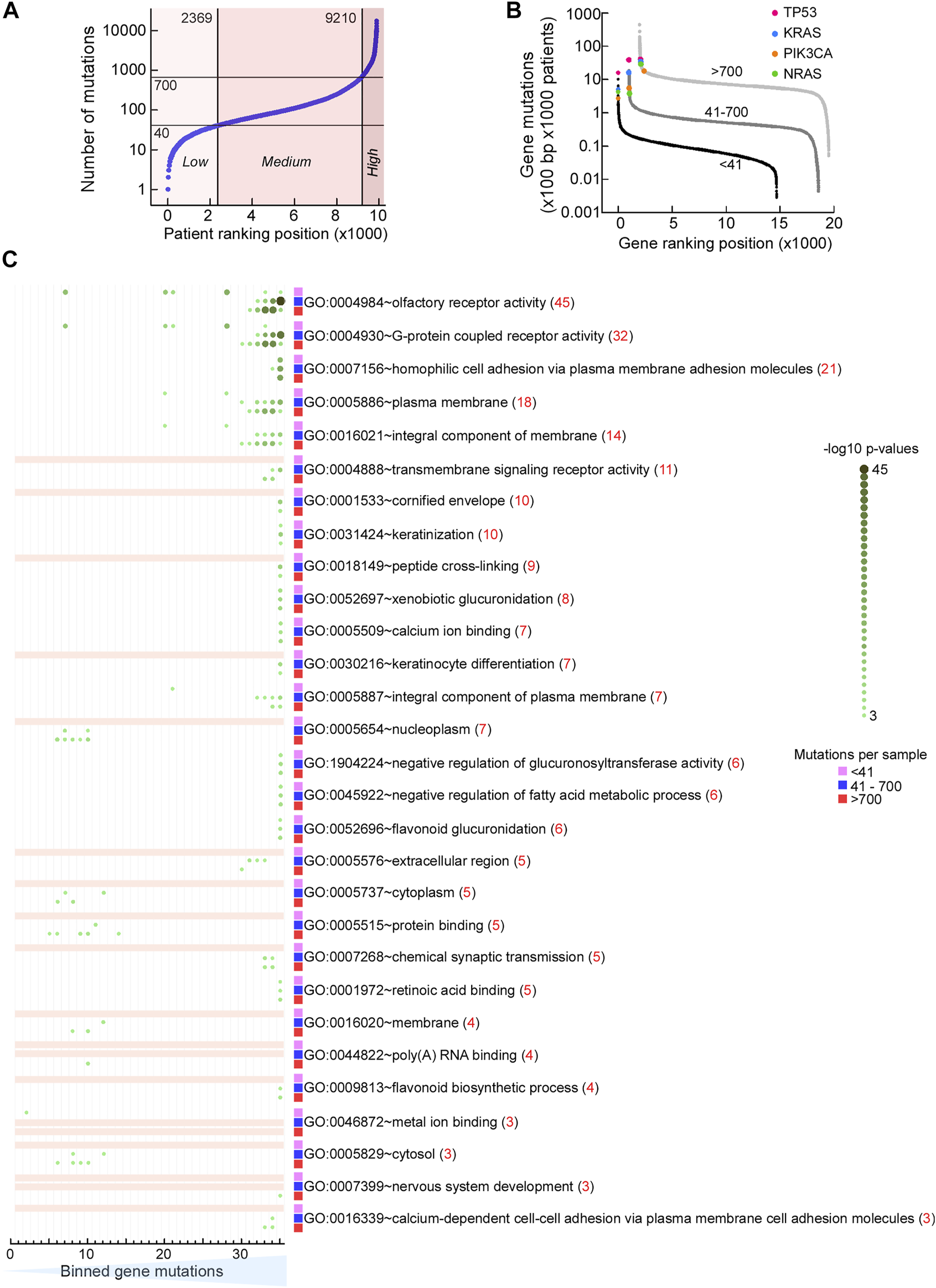 Mutation rates are similar within pathways. (A) Dot plot of TCGA samples ranked by the number of simple mutations in coding gene regions. Horizontal reference lines, cutoffs for number of mutations for “low,” “medium,” and “high” mutation load groups (MLGs); vertical reference lines, ranking position cutoffs. (B) Dot plot of ranked normalized numbers of coding gene mutations in the “low” (black), “medium” (dark gray), and “high” (light gray) MLGs. Color, ranking position of commonly mutated oncogenes. (C) Heat map of Gene Ontology (GO) terms for genes ranked in (B) for the three MLGs. Ranked genes in (B) were split into 35 bins of increasing mutational loads (x-axis) so that each bin contained ∼400 genes, irrespective of MLG. Each set of 400 genes was then used to conduct a GSEA using DAVID (https://david.ncifcrf.gov) and the strongest Benjamini–Hochberg-corrected p-value for each GO term within each MLG (red value in parenthesis) was then used to rank the results. For all three MLGs, the most mutated genes (bins ∼30–35) were the olfactory receptor genes (top 2 GO terms) and plasma membrane molecules involved in homophilic cell–cell adhesion (GO terms 3–5). Color-coding and size scale, Benjamini–Hochberg-corrected p-values within individual bins. Pink rectangle, no significant enrichment.