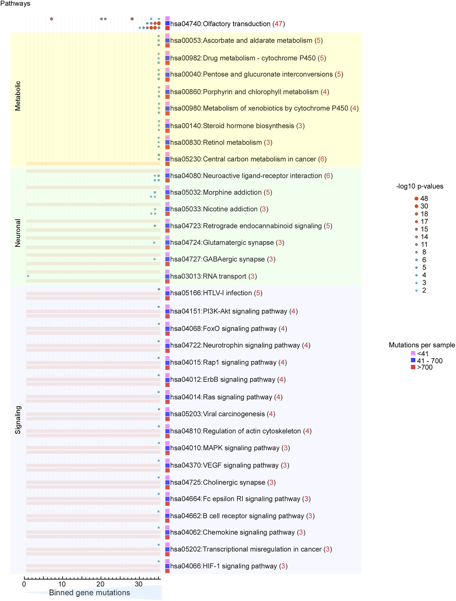 Signaling pathways are selectively mutated in patients with “low” mutation loads. Heat map of KEGG pathway analysis of GSEA. Yellow background, highly mutated metabolic genes observed in all three MLGs. Pale green background, highly mutated neuronal pathways only detected in the “medium” and “high” MLGs. Light purple background, highly mutated signaling pathways selectively mutated in the “low” MLG. Color-coding and size scale, Benjamini–Hochberg-corrected p-values within individual bins. Pink rectangle, no significant enrichment.