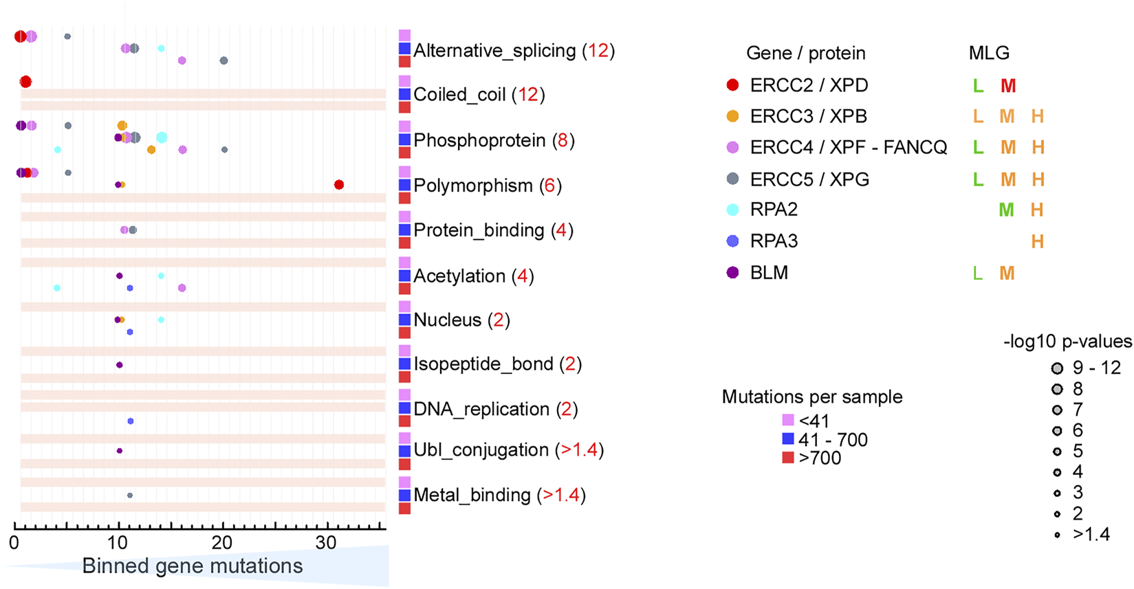 DNA repair genes incur low mutation rates in cancer genomes. Heat map of UniProtKB keywords for the DNA repair genes in this study from GSEA. Color-coding and size scale, Benjamini–Hochberg-corrected p-values for each individual DNA repair gene within each bin. Occasionally 2–3 genes fell within the same bin. Pink rectangle, no significant enrichment. MLG color coding: green, mutated at low rates (bins 1–5); orange, mutated at medium rates (bins 10–20); red, mutated at elevated rates (bin 31).