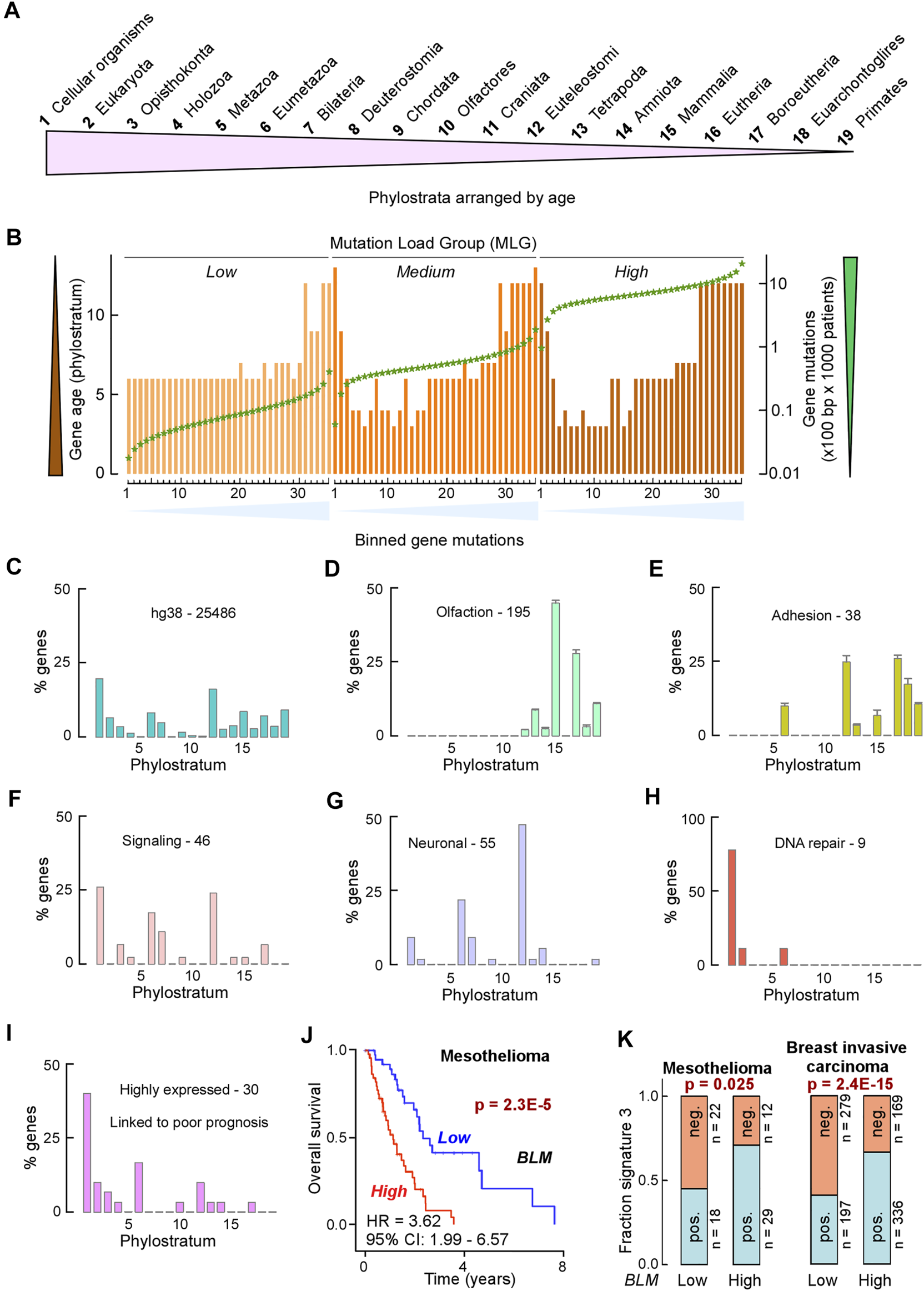 Mutation rates decrease with gene age. (A) Cartoon of phylostrata arranged by age from the origin of life to now. (B) Bar graph displaying the median age (as phylostratum, left scale) and the median of normalized mutations (×100 bp × 1000 cancer patient samples, green stars) for each of the 35 bins containing ranked mutated genes (see Figure 10). (C–I) Bar graph of percent genes in each of the 19 phylostrata. (C) Whole genome; (D) GO:0004984 (olfactory receptor activity) from Figure 10 (mean ± SE from low, medium and high MLGs); (E) GO:0007156 (homophilic cell adhesion via plasma membrane molecules) from Figure 10 (mean ± SE from low, medium and high MLGs); (F) combined signaling pathways for the low MLG from Figure 11; (G) combined neuronal KEGG terms for the medium MLG from Figure 11; (H) DNA repair genes in this study; (I) 30 genes most frequently associated with poor prognosis when overexpressed (Hambarde et al., 2021). (J) Kaplan–Meier curve of TCGA mesothelioma patients with low (below mean) and high (above mean) BLM mRNA levels. Hazard ratio (HR) and confidence interval (CI) are given. p-value from logrank test. (K) Bar plot of fraction of TCGA patients with low or high BLM mRNA levels exhibiting patterns of single-base substitutions conforming to signature 3 positive (pos.) or negative (neg.) in mesothelioma (left) and breast invasive carcinoma (right). n, number of samples; p-values from Fisher’s exact tests.