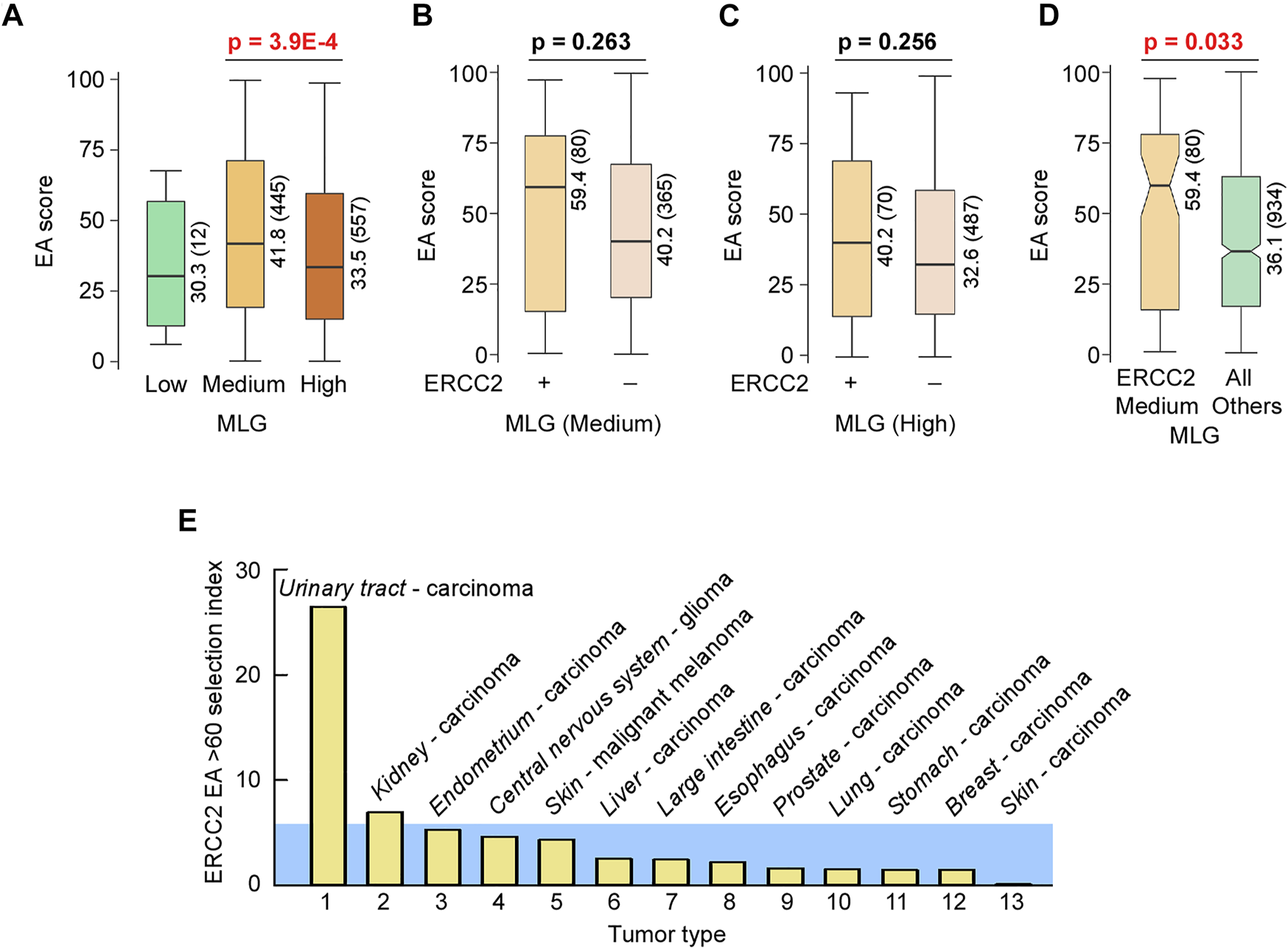 A measure of selection for damaging mutations in ERCC2 in different tumor types was computed as follows: si = (mut*100/tot)/(med/1000), where mut was the number of samples with ERCC2 mutations with EA score ≥60; tot was the total number of samples of a tumor type; med was the median number of mutations for all samples of a tumor type.