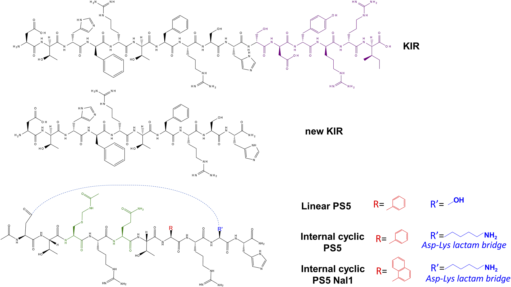 Chemical structures of KIR-based SOCS1 proteomimetics. Green represents non-native residues in PS5 upon combinatorial modifications (Cys(Acm) and Gln), blue represents the residue is alternatively Ser60 in PS5 and Lys in internal cycles PS5 for the formation of lactam bridge (with Asp52), and red represents the aromatic residue Nal1 or Phe56.