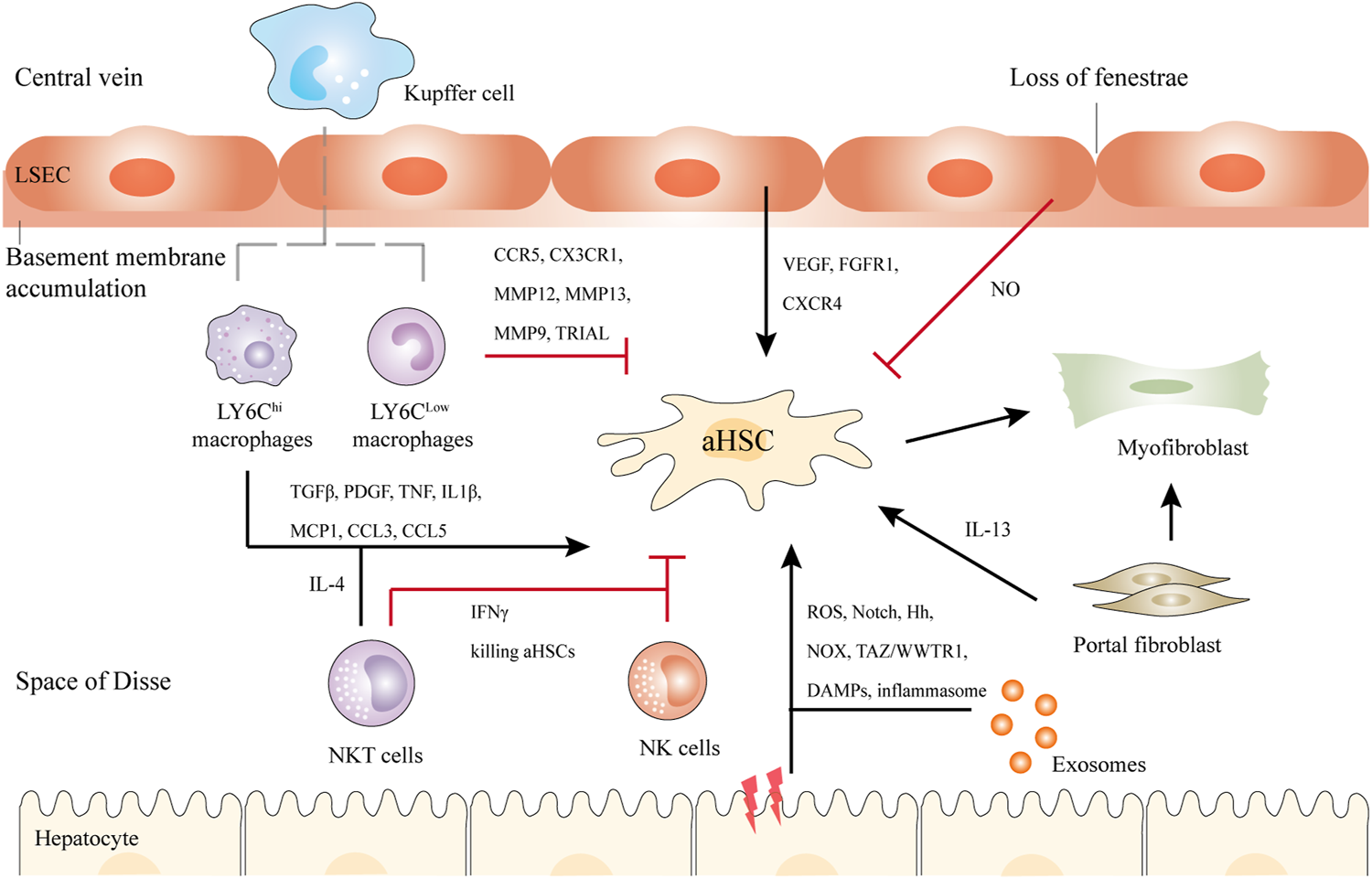 Schematic illustration of the crosstalk between HSCs and Kupffer cells, NK cells, NKT cells, hepatocytes, bone marrow-derived macrophages, and LSECs in liver fibrosis. Briefly, upon liver injury, hepatocytes undergo damage, and inflammatory, releasing DAMPs, exosomes, etc. LY6Chi macrophages activate HSCs by TGFβ, IL1β, and other cytokines, while LY6Clow macrophages show antifibrotic ability via CX3CR1, MMP12, MMP13, etc. NKT cells and NK cells secret IFNγ to kill aHSCs. NKT cells can also activate HSCs through IL-4. In addition, LSECs undergo capillarization and accumulation of basement membranes. They can promote either liver regeneration or fibrosis. Another population of myofibroblasts is the portal fibroblasts, which can also activate HSCs in cholestatic liver. Black and red arrows represent promotion or inhibition of aHSCs respectively.