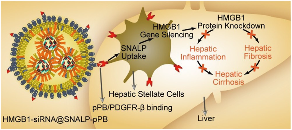 Schematic diagram of the HMGB1-siRNA@SNALP-pPB nanoparticle targeting HSCs to silence HMGB1 to show antifibrotic and anti-inflammatory effects for hepatic cirrhosis (Zhang et al., 2020).
