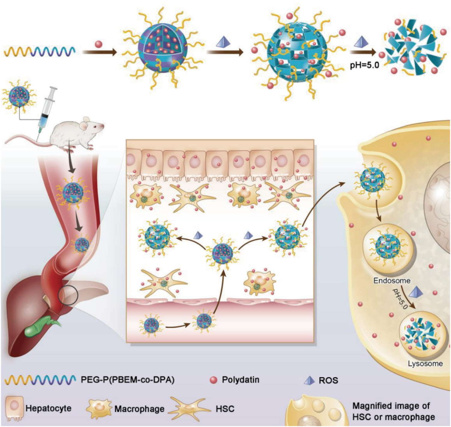 Schematic illustration of PEG-P (PBEM-co-DPA)-Polydatin, a ROS, and pH dual-responsive nanodrug that regulates multiple cell types for the treatment of liver fibrosis (Lin et al., 2020).
