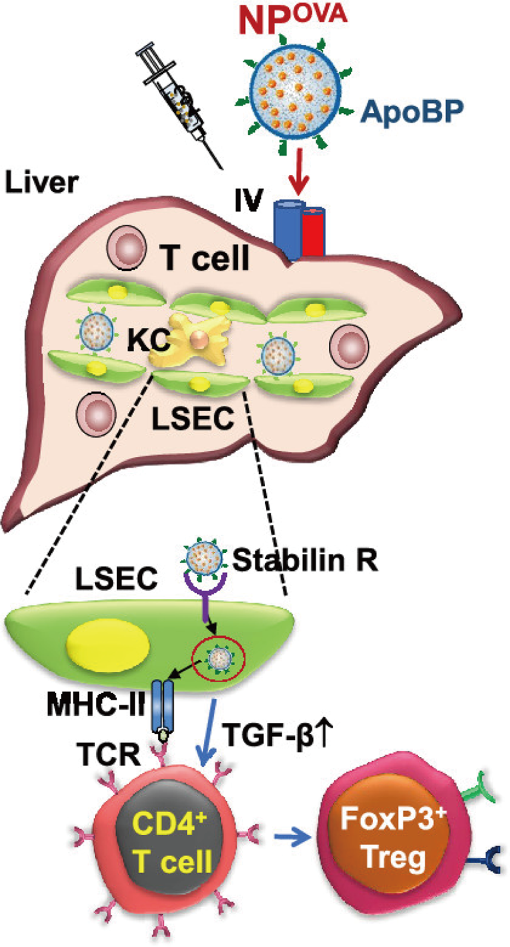 Schematic diagram of the working model for liver-targeting tolerogenic nanoparticles. NPs attached ApoBP ligand delivering the antigens are epitopes to LSECs in the liver through endocytic uptake. Antigen processing and presentation to naive T-cells could generate Foxp3+ Tregs, which are recruited to the site of pathology, where they exert immunosuppressive effects (Liu et al., 2021).