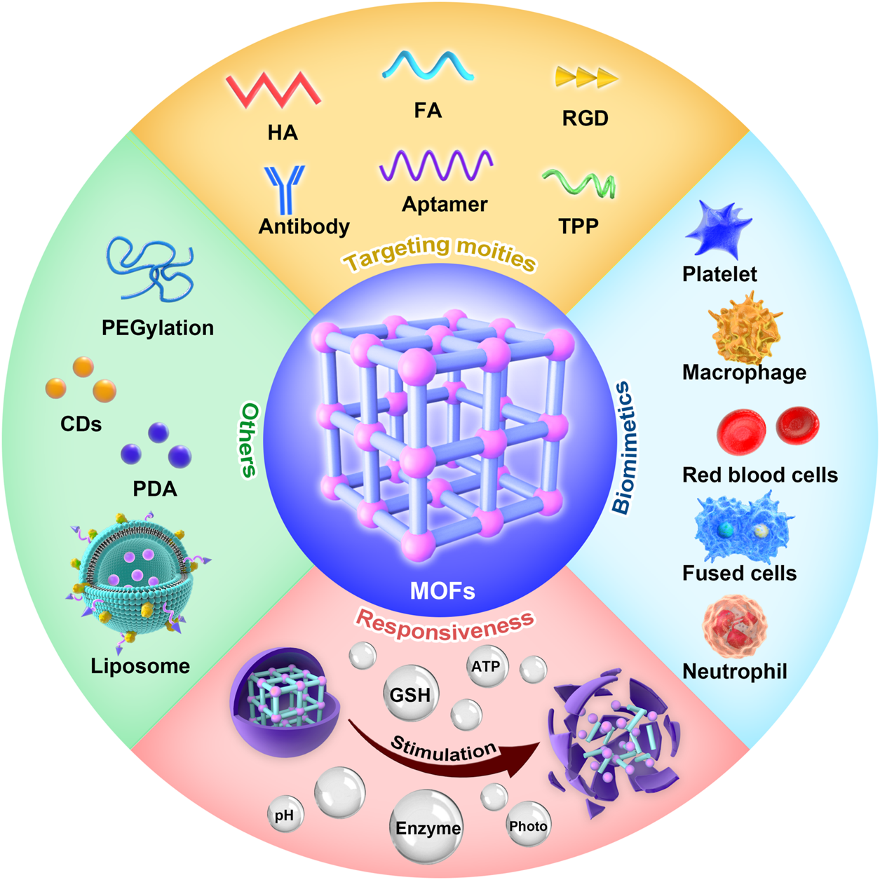 FIGURE 2. Functionalities of metal–organic frameworks (MOFs), including targeting moieties, biomimetics, and responsiveness.