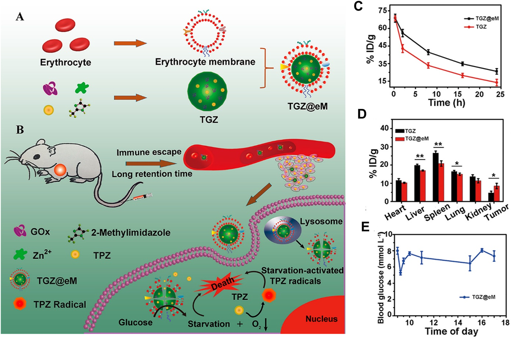 FIGURE 3. Synthesis, application, and pharmacokinetics of erythrocyte membrane-cloaked metal–organic frameworks (MOF), TGZ@eM. (A) Schematic illustration of TGZ@eM synthesis. (B) Application diagram of TGZ@eM in cancer treatment. (C) In vivo pharmacokinetics of TGZ@eM and TGZ. (D) Biodistribution of TGZ@eM and TGZ. (E) Blood glucose level of mice during daytime after injection with TGZ@eM. Reproduced with permission. Copyright 2018, ACS Nano.