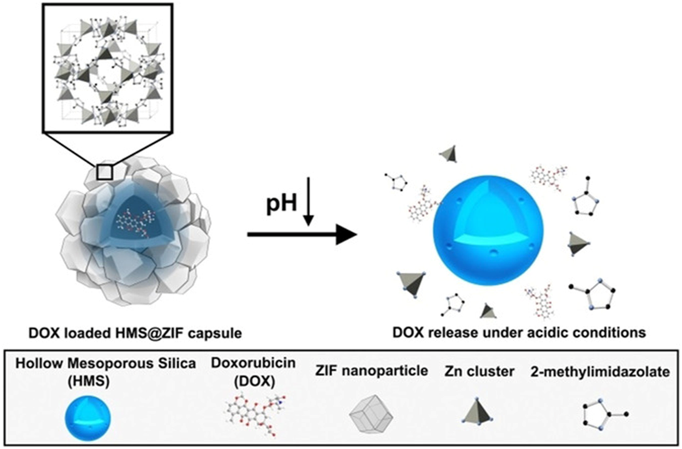 FIGURE 4. Schematic illustration of hollow mesoporous silica/metal–organic framework (HMS/MOF) pH responsiveness. Reproduced with permission. Copyright 2018, ChemMedChem.
