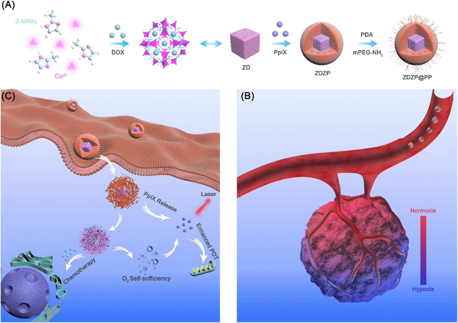 FIGURE 5. Schematic of ZDZP@PP NPs in photodynamic therapy (PDT)/chemotherapy combination therapy for tumor. (A) Synthesis of ZDZP@PP Nanoparticles. (B,C) Schematic illustration of ZDZP@PP in combination therapy. Reproduced with permission. Copyright 2020, ACS Applied Materials & Interfaces.