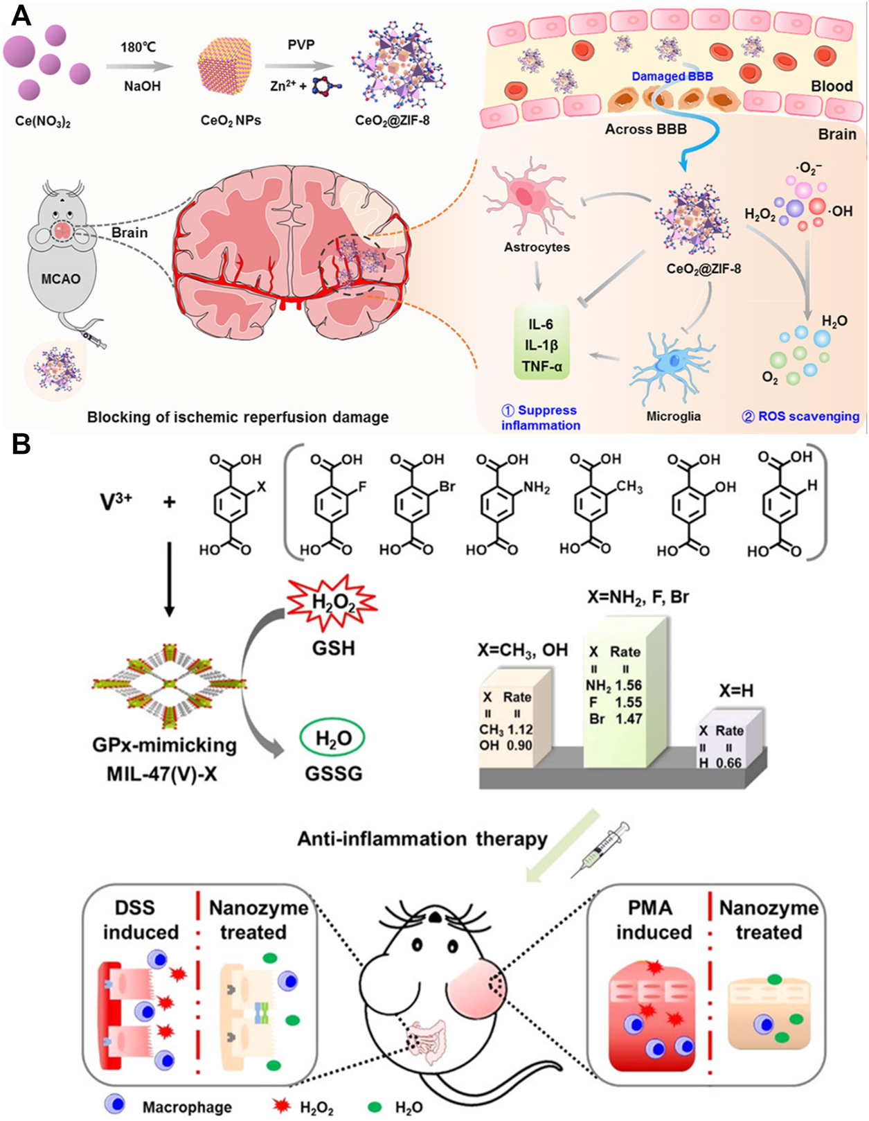 FIGURE 6. Schematic of nanozyme based on metal–organic frameworks (MOFs) for inflammatory diseases treatment. (A) Schematic of CeO2@ZIF-8 synthesis and application mechanism against ischemic stroke. Reproduced with permission. Copyright 2020, Science Advances. (B) Schematic of designing principle and application in the anti-inflammatory treatment of GPx-mimicking MIL-47(V)-X-MOF nanozymes. Reproduced with permission. Copyright 2021, Angewandte Chemie International Edition.