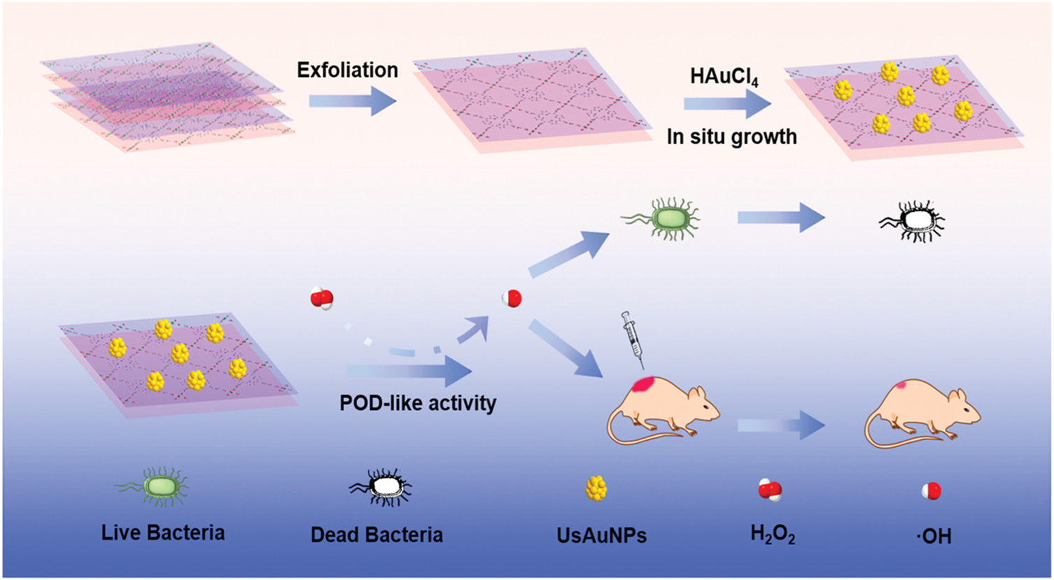 FIGURE 7. Schematic of UsAuNP/metal–organic framework (MOF) hybrid with POD-like activity for antibacterial therapy. Reproduced with permission. Copyright 2020, Small.