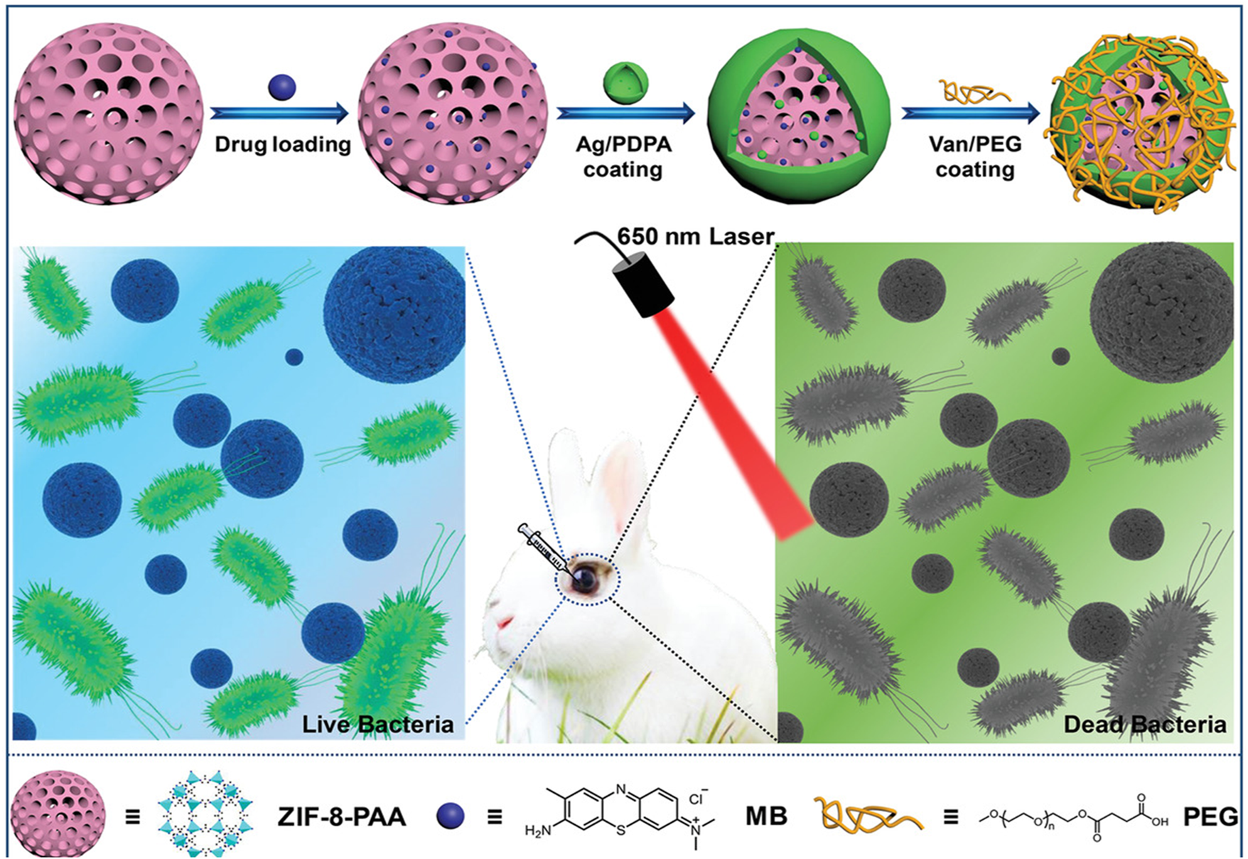 FIGURE 8. Schematic of ZPMAVP system for application in synergistic chemotherapy and photodynamic therapy for endophthalmitis. Reproduced with permission. Copyright 2019, Small.