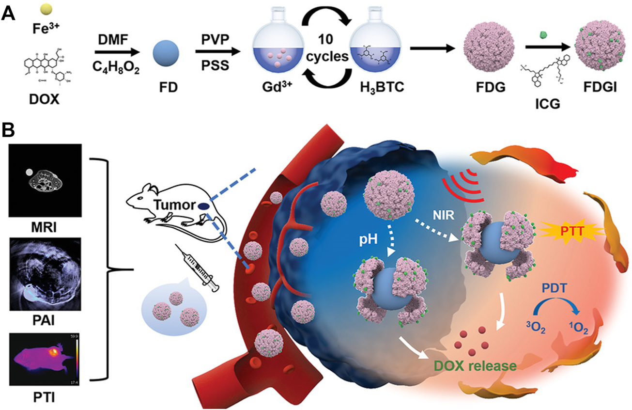 Nanomedicine, aiming to solve health and medicine problems using nanomaterials with size at nanometer scales, has become a promising field. Applications of nanomedicine include developing delivery systems, contrast agents, sensors for effective chemotherapy, and diagnostics (Nance, 2019). Nanomaterials play an irreplaceable role in nanomedicine, with various resultant materials, such as organic materials, inorganic nanoparticles, and organic–inorganic hybrids, of which metal–organic frameworks (MOFs) are promising platforms in disease theranostics.
