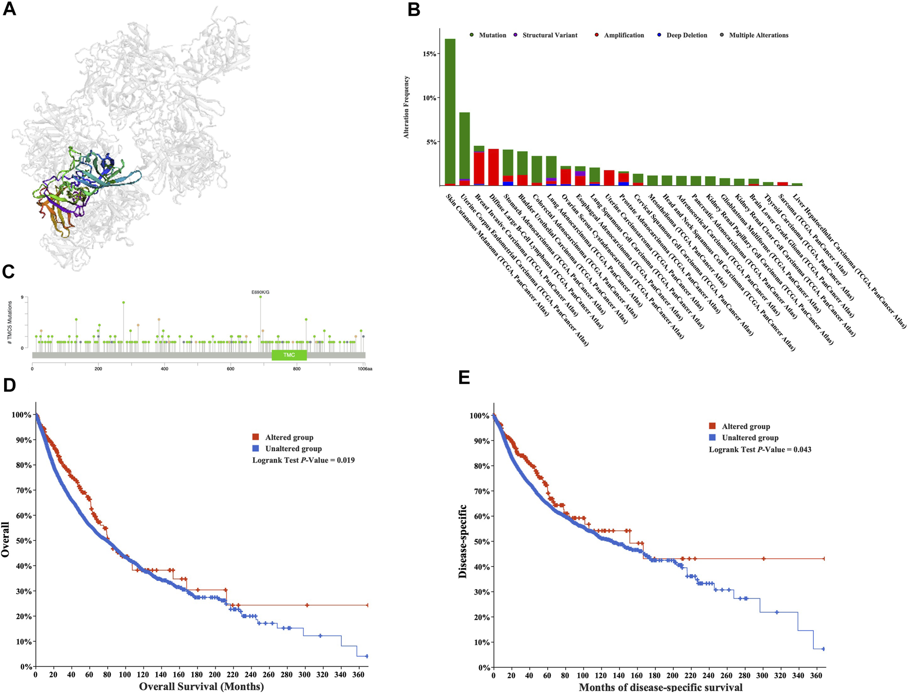 Mutation analysis of TMC5 in different cancers. (A) 3D structure of TMC5 gene transcript. (B) Summary of mutation types of TMC5 (structural variant data, mutation data, and copy number variant data) and the distribution among different cancers. (C) Hot spots of mutation of TMC5. (D,E) Alteration of TMC5 was associated with shorter OS and DSS.