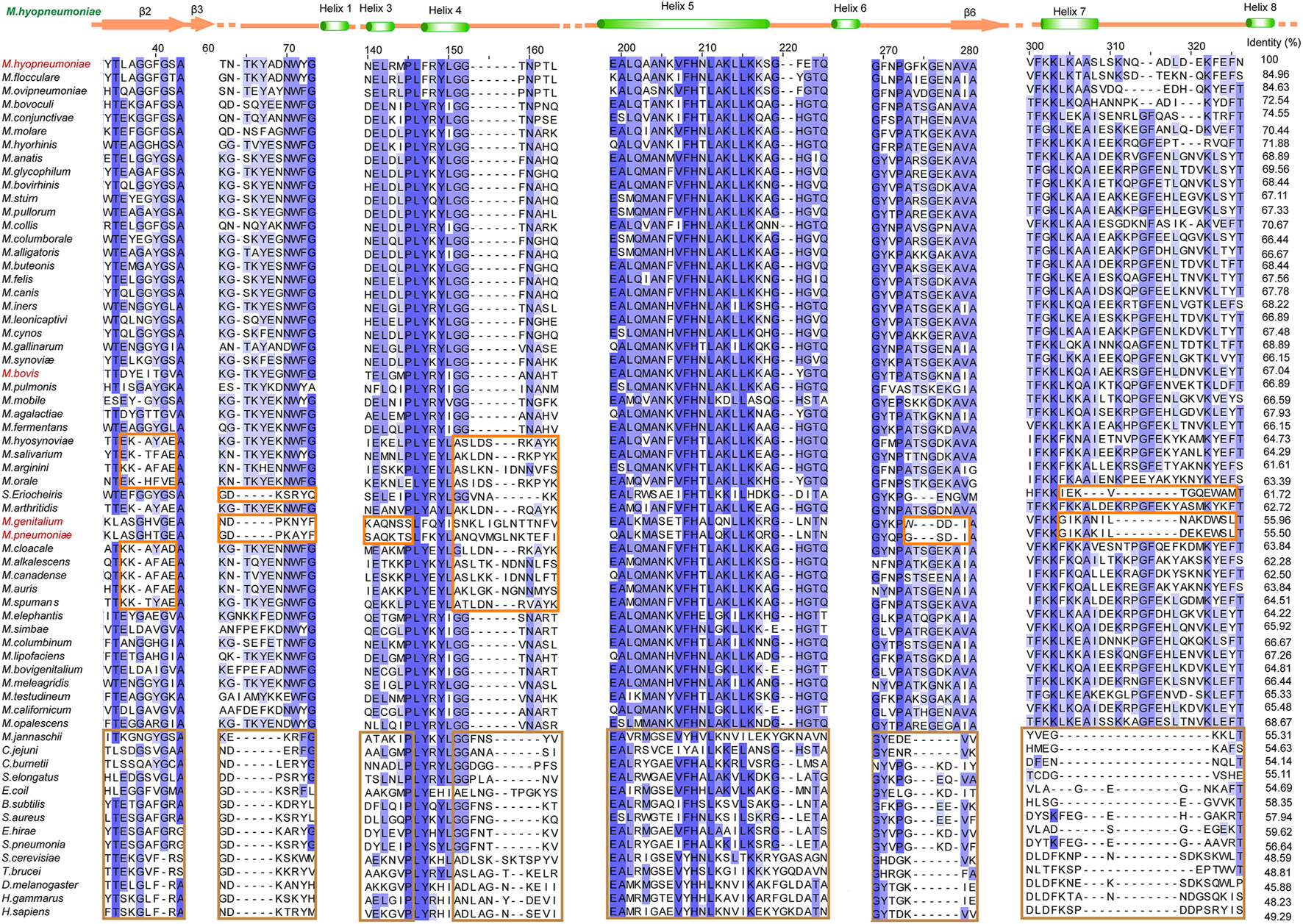 Different sequence patterns among different enolases. Partial sequence alignment of enolases from different species. The full sequence identities are shown at the end of each sequence. The secondary structure of Mhp Eno is shown above the alignment. Different sequence patterns are highlighted with orange and brown rectangles for Mollicutes and non-Mollicutes, respectively. For sequence accession numbers, please refer to supplementary materials.