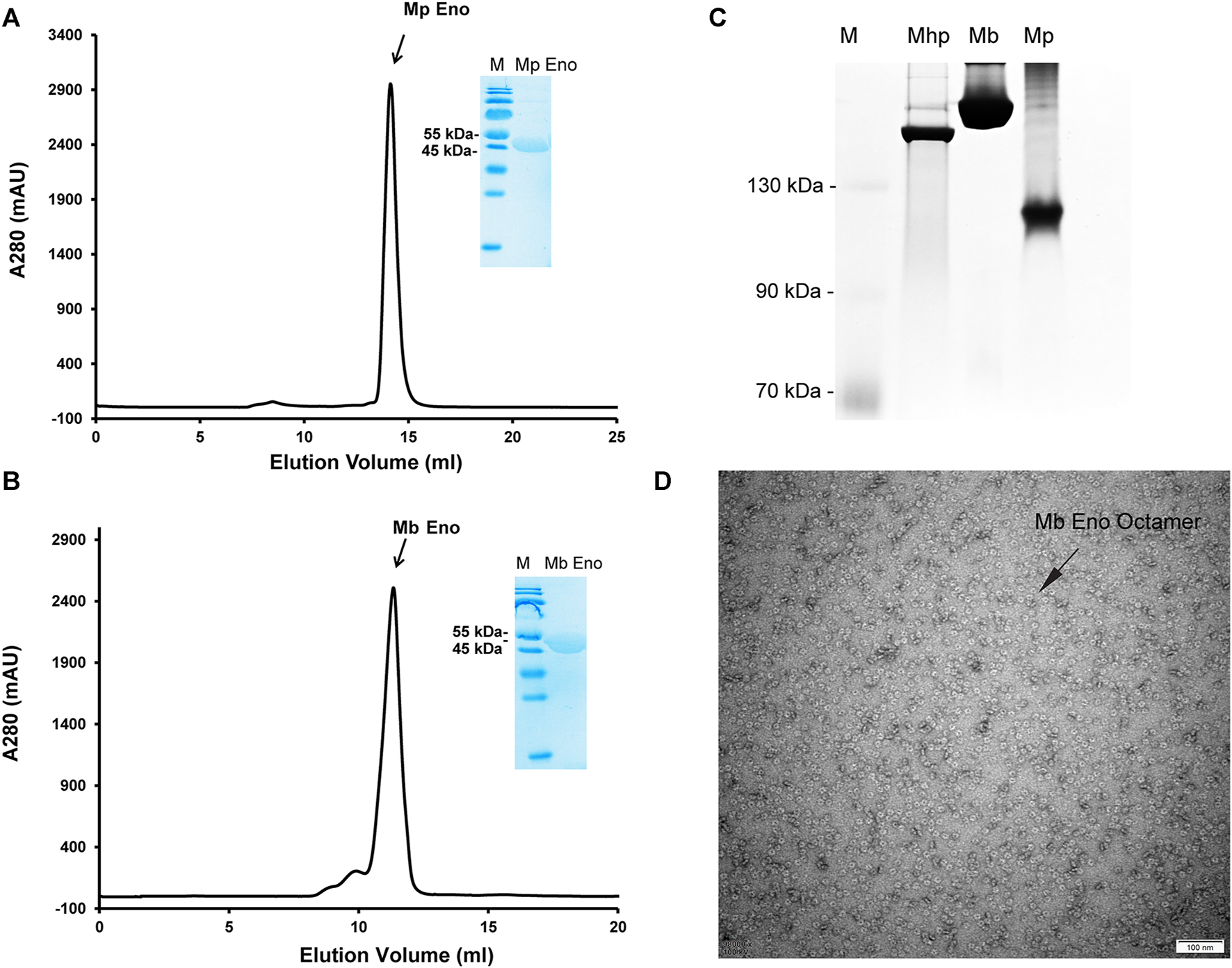 Mp Eno and Mb Eno oligomeric conformations. (A,B) Gel filtration of Mp Eno (A) and Mb Eno (B). Mp Eno and Mb Eno purities were checked by SDS-PAGE and are shown in the inset images. (C) Native PAGE analysis of Mhp Eno, Mb Eno and Mp Eno. The protein marker sizes are indicated to the right of the picture. (D) Negative staining of Mb Eno; the scale is indicated.