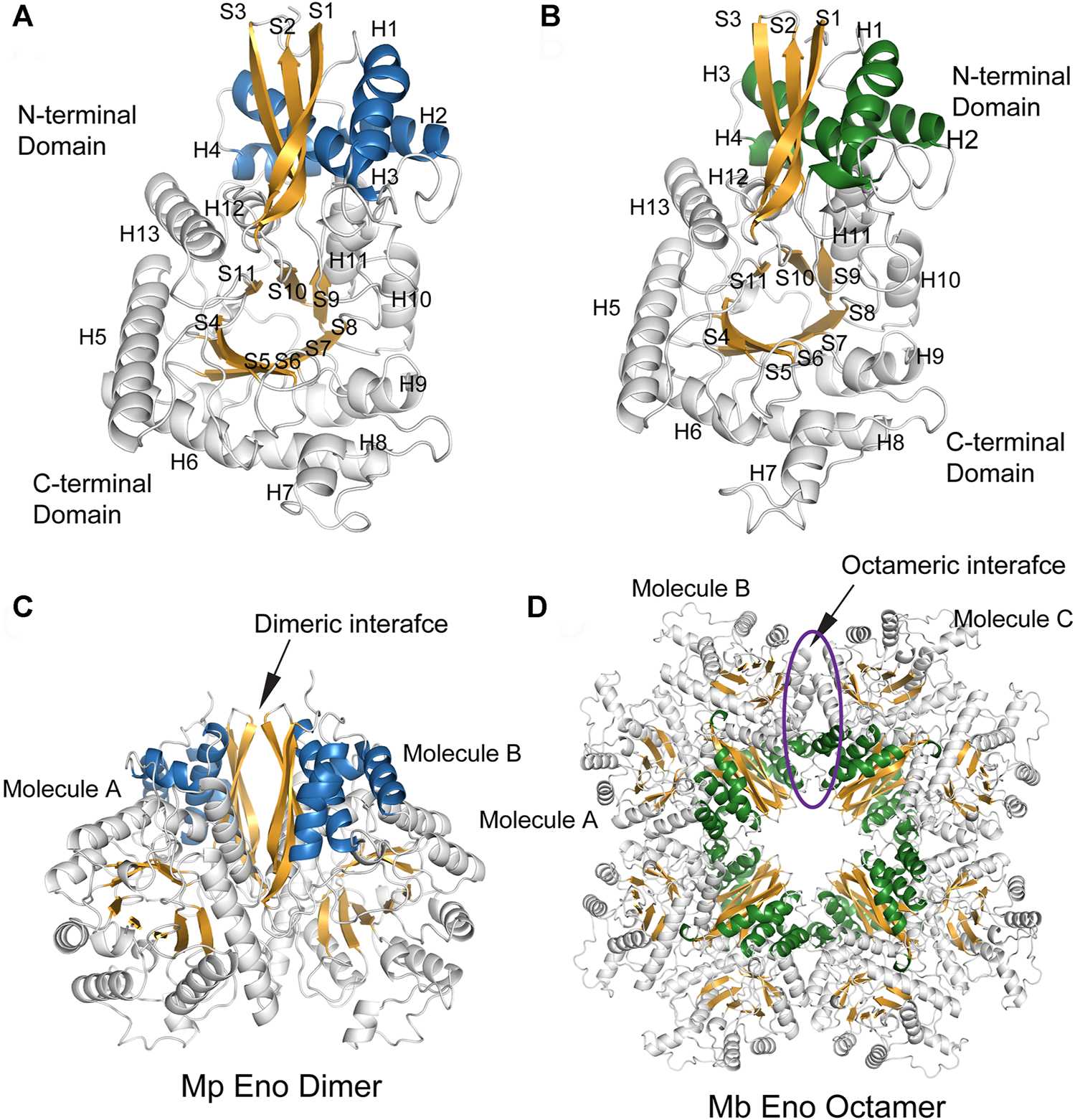 The overall structures of Mp Eno and Mb Eno. (A,B) Structures of one molecule each of Mp Eno (A) and Mb Eno (B). β-Strands and α-helices are sequentially numbered; “S” indicates a β-strand, and “H” indicates an α-helix. The β-strands are shown in orange. The α-helices of the N-terminal domains are shown in blue and green, in Mp Eno and Mb Eno, respectively. (C,D) Overall structures of Mp Eno (C) and Mb Eno (D). (C) Mp Eno is a dimer. (D) Mb Eno is an octamer.