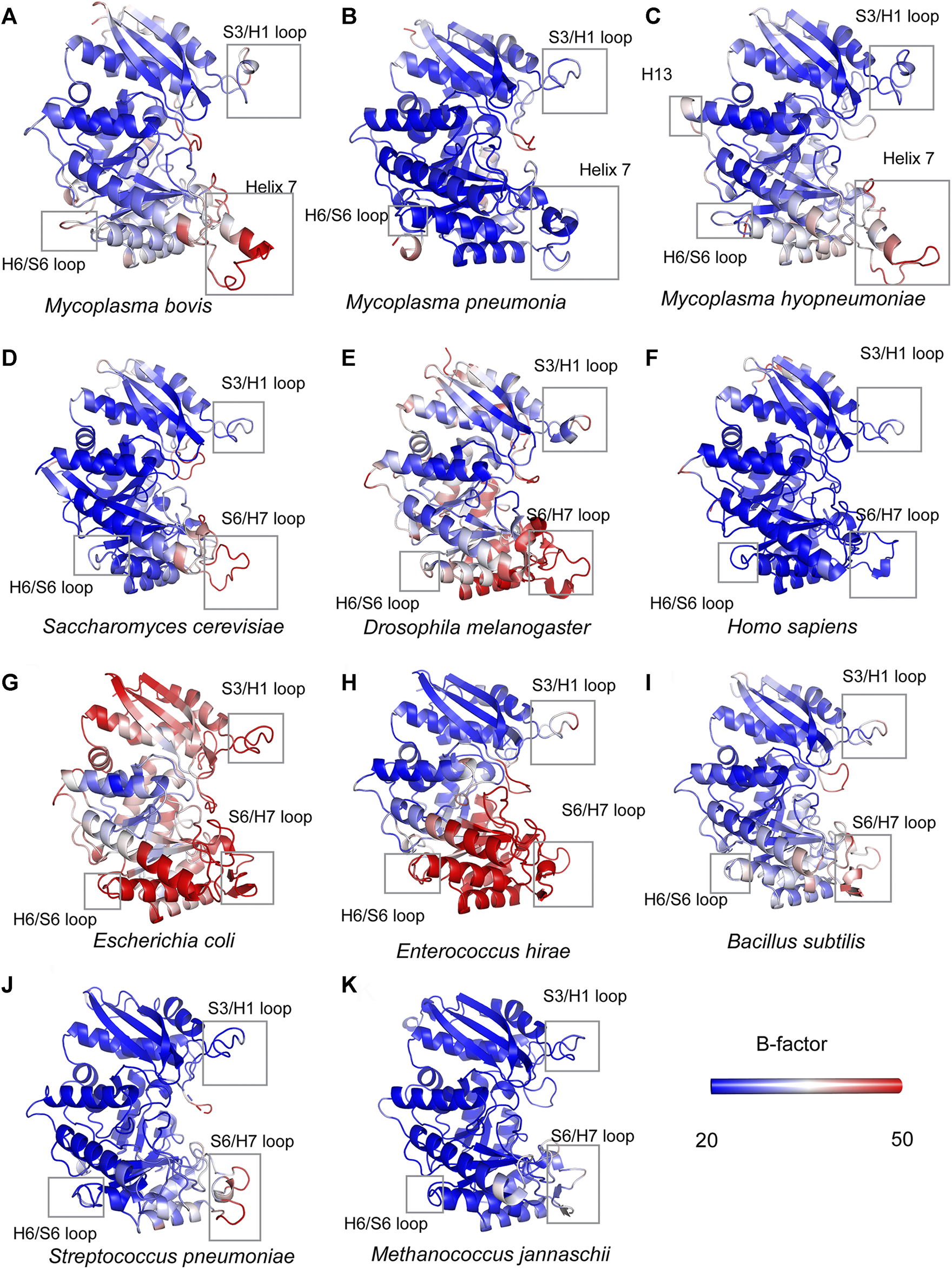 Structural comparisons of mycoplasma enolases and other enolases. All the enolases are shown in cartoon mode and in the color of blue-white-red spectrum according to crystallographic B factors. The color bars show the B-factor scales for the corresponding forms. Species names are below corresponding enolase structure modes. Helix 7, H13, H6/S6 loop, S6/H7 loop regions are marked by rectangles. The accession numbers for enolases are the same as used in Supplementary Table S2.